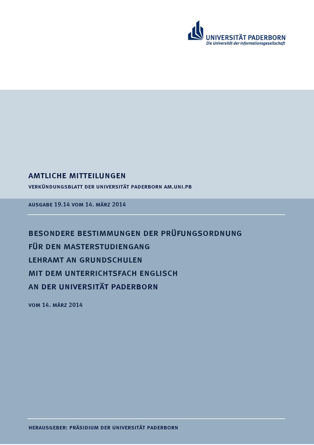Besondere Bestimmungen der Prüfungsordnung für den Masterstudiengang Lehramt an Grundschulen mit dem Unterrichtsfach Englisch an der Universität Paderborn : vom 14. März 2014