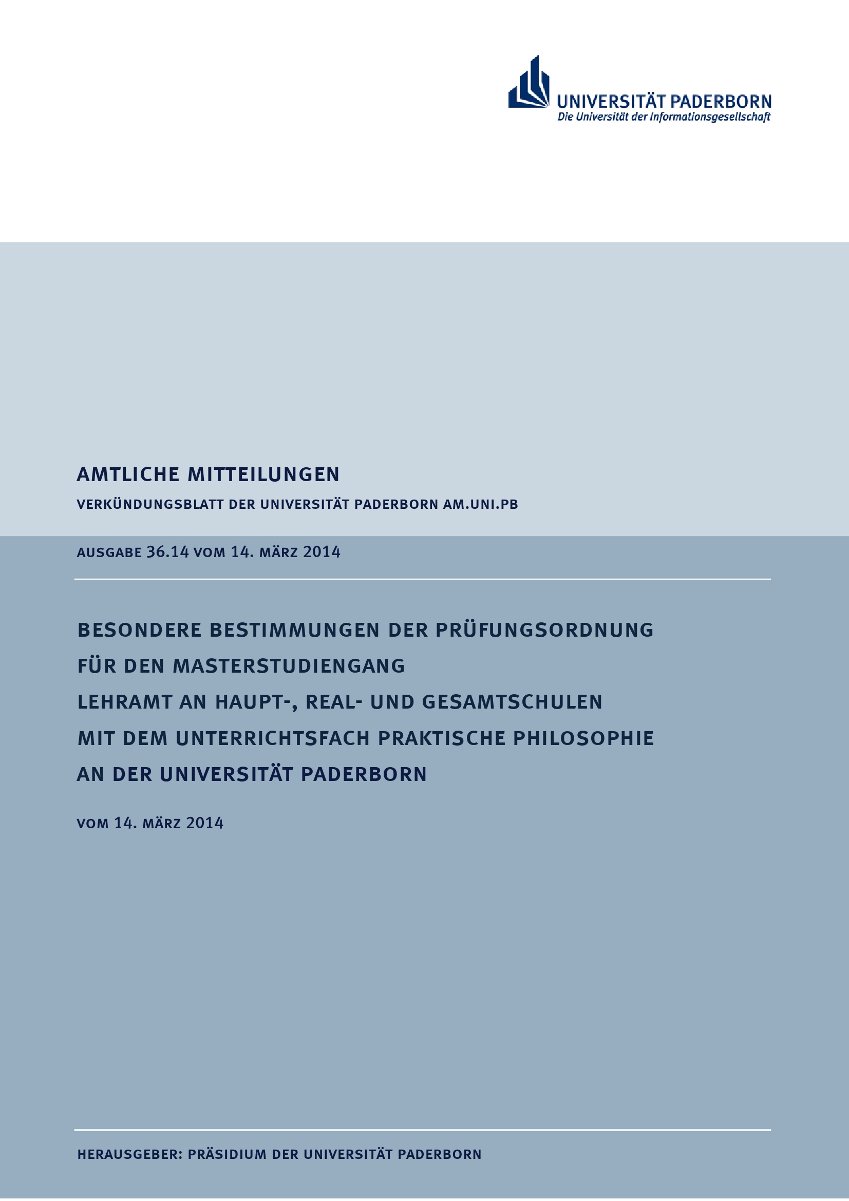Besondere Bestimmungen der Prüfungsordnung für den Masterstudiengang Lehramt an Haupt-, Real- und Gesamtschulen mit dem Unterrichtsfach Praktische Philosophie an der Universität Paderborn : vom 14. März 2014