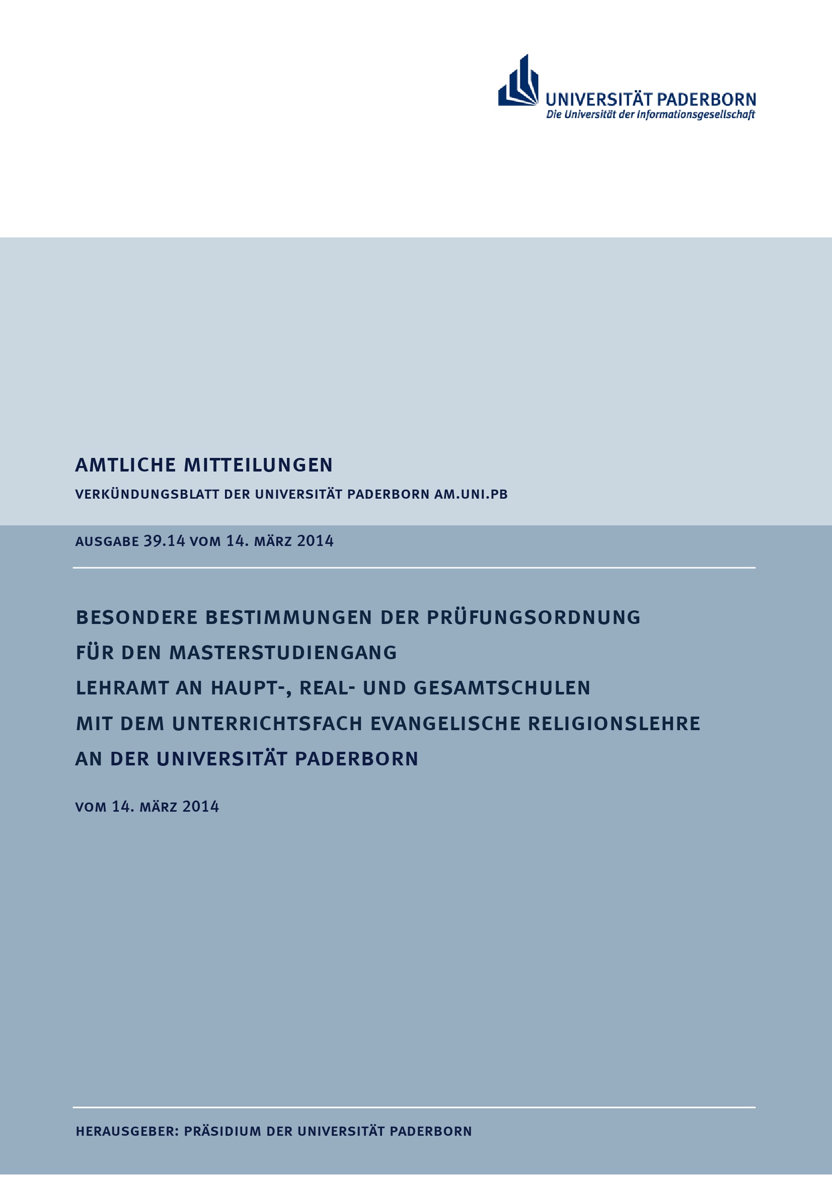 Besondere Bestimmungen der Prüfungsordnung für den Masterstudiengang Lehramt an Haupt-, Real- und Gesamtschulen mit dem Unterrichtsfach evangelische Religionslehre an der Universität Paderborn : vom 14. März 2014