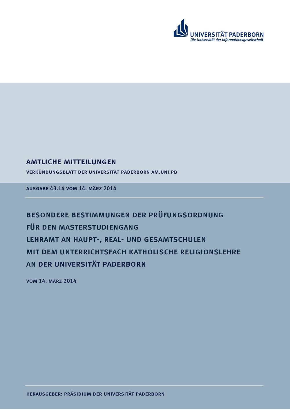 Besondere Bestimmungen der Prüfungsordnung für den Masterstudiengang Lehramt an Haupt-, Real- und Gesamtschulen mit dem Unterrichtsfach katholische Religionslehre an der Universität Paderborn : vom 14. März 2014