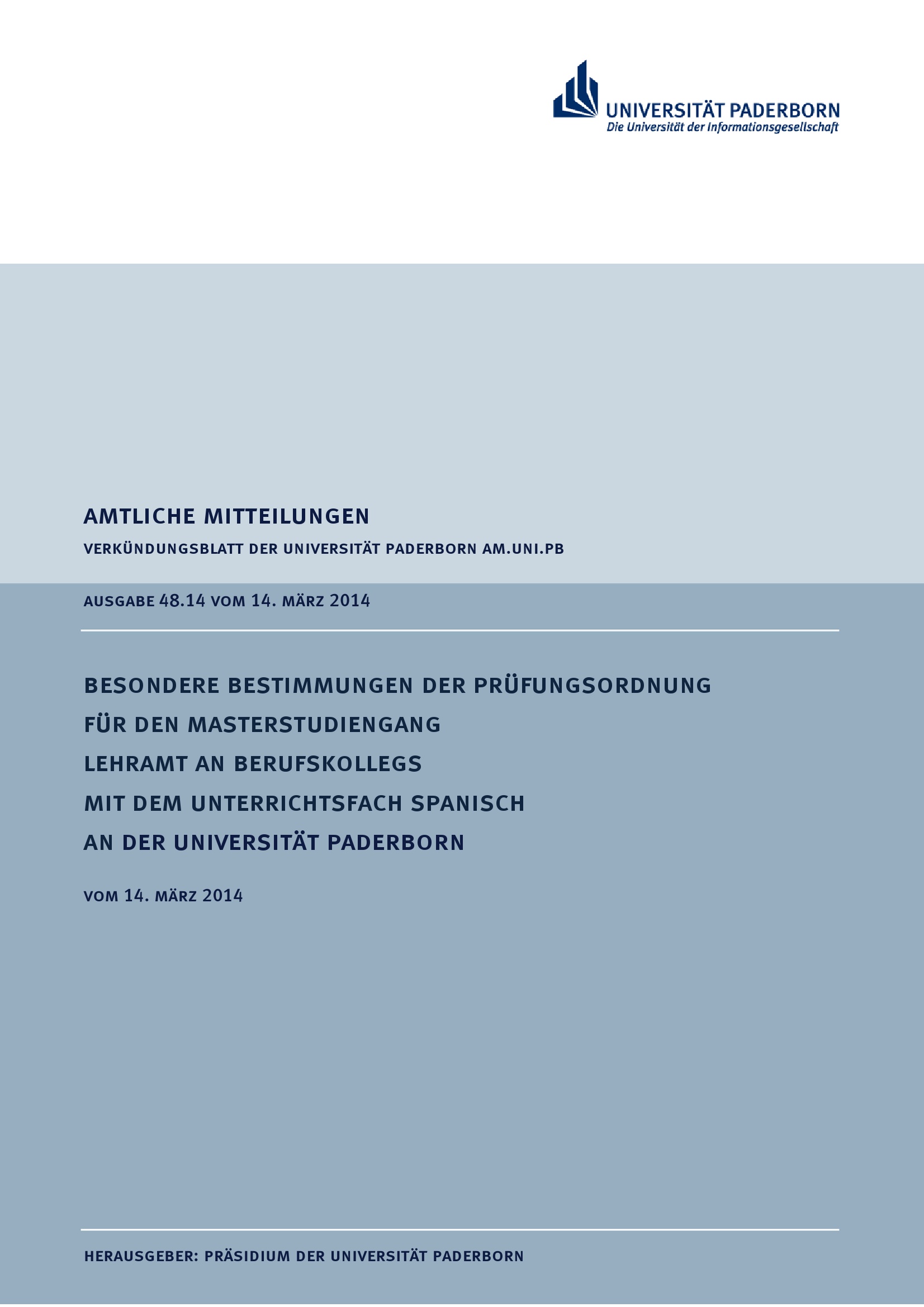 Besondere Bestimmungen der Prüfungsordnung für den Masterstudiengang Lehramt an Berufskollegs mit dem Unterrichtsfach Spanisch an der Universität Paderborn : vom 14. März 2014