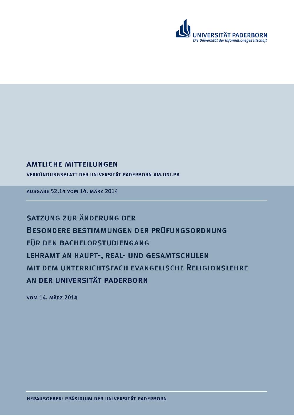 Satzung zur Änderung der besondere Bestimmungen der Prüfungsordnung für den Bachelorstudiengang Lehramt an Haupt-, Real- und Gesamtschulen mit dem Unterrichtsfach evangelische Religionslehre an der Universität Paderborn : vom 14. März 2014