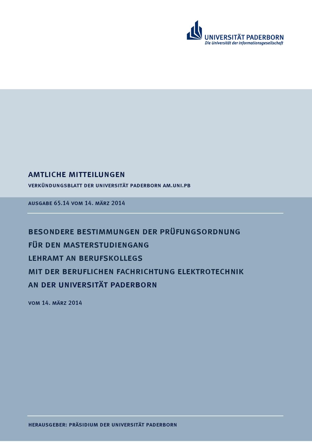 Besondere Bestimmungen der Prüfungsordnung für den Masterstudiengang Lehramt an Berufskollegs mit der beruflichen Fachrichtung Elektrotechnik an der Universität Paderborn : vom 14. März 2014
