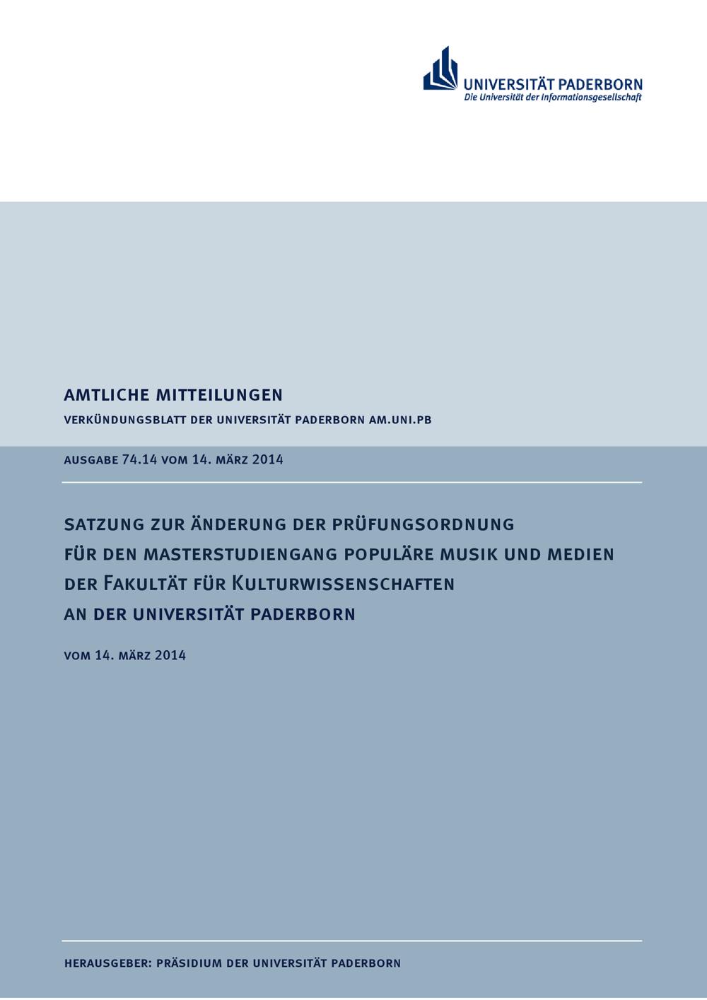 Satzung zur Änderung der Prüfungsordnung für den Masterstudiengang populäre Musik und Medien der Fakultät für Kulturwissenschaften an der Universität Paderborn : vom 14. März 2014