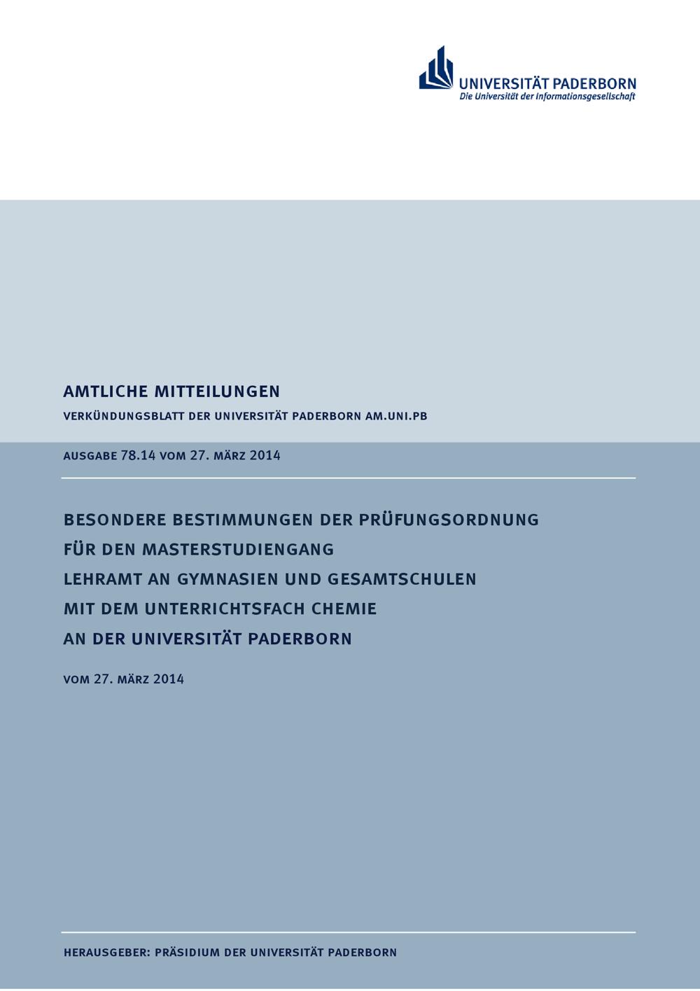 Besondere Bestimmungen der Prüfungsordnung für den Masterstudiengang Lehramt an Gymnasien und Gesamtschulen mit dem Unterrichtsfach Chemie an der Universität Paderborn : vom 27. März 2014