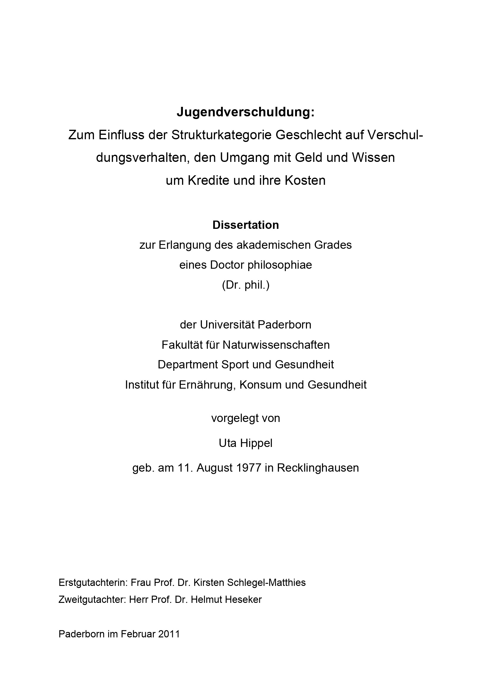 Jugendverschuldung : zum Einfluss der Strukturkategorie Geschlecht auf Verschuldungsverhalten, den Umgang mit Geld und Wissen um Kredite und ihre Kosten