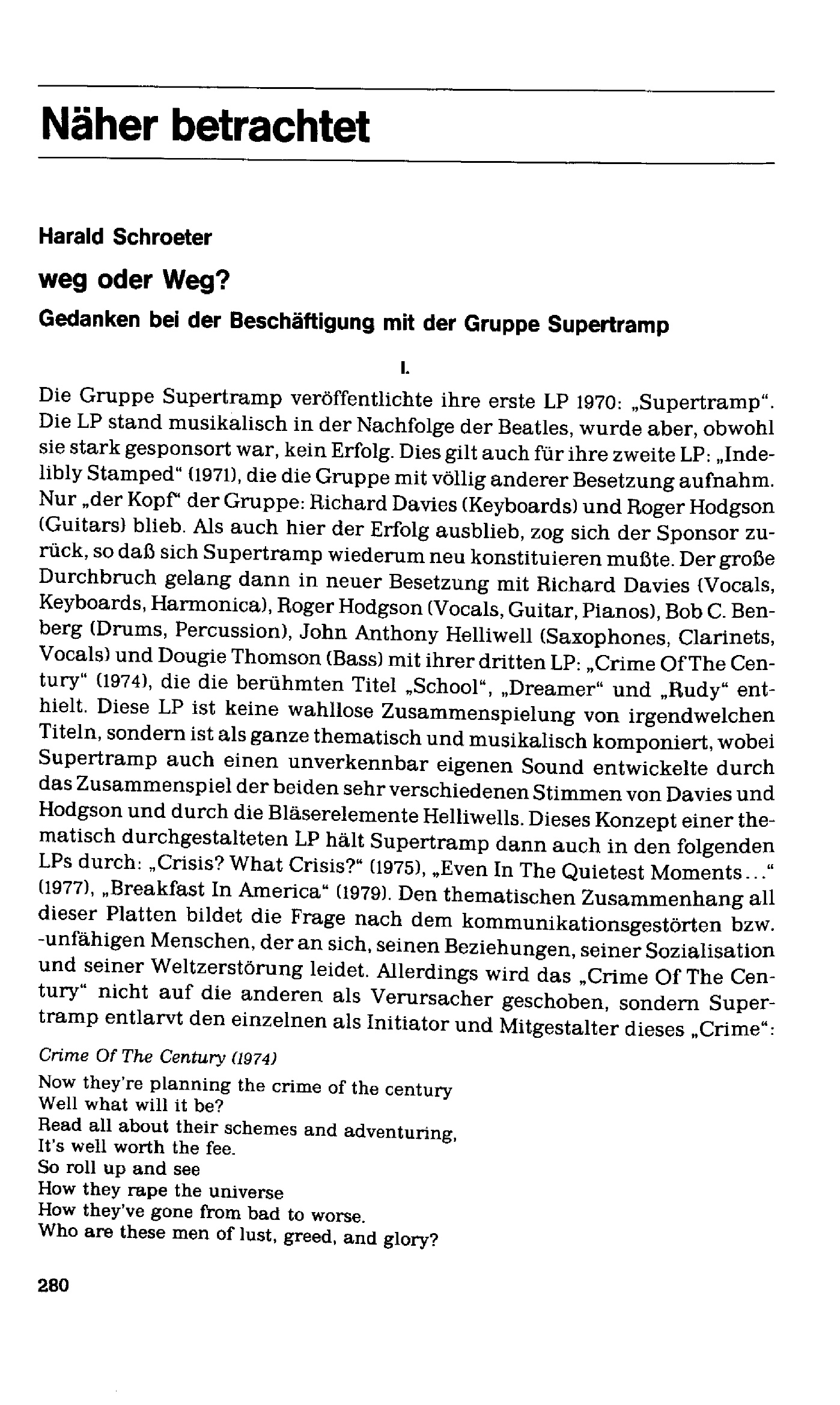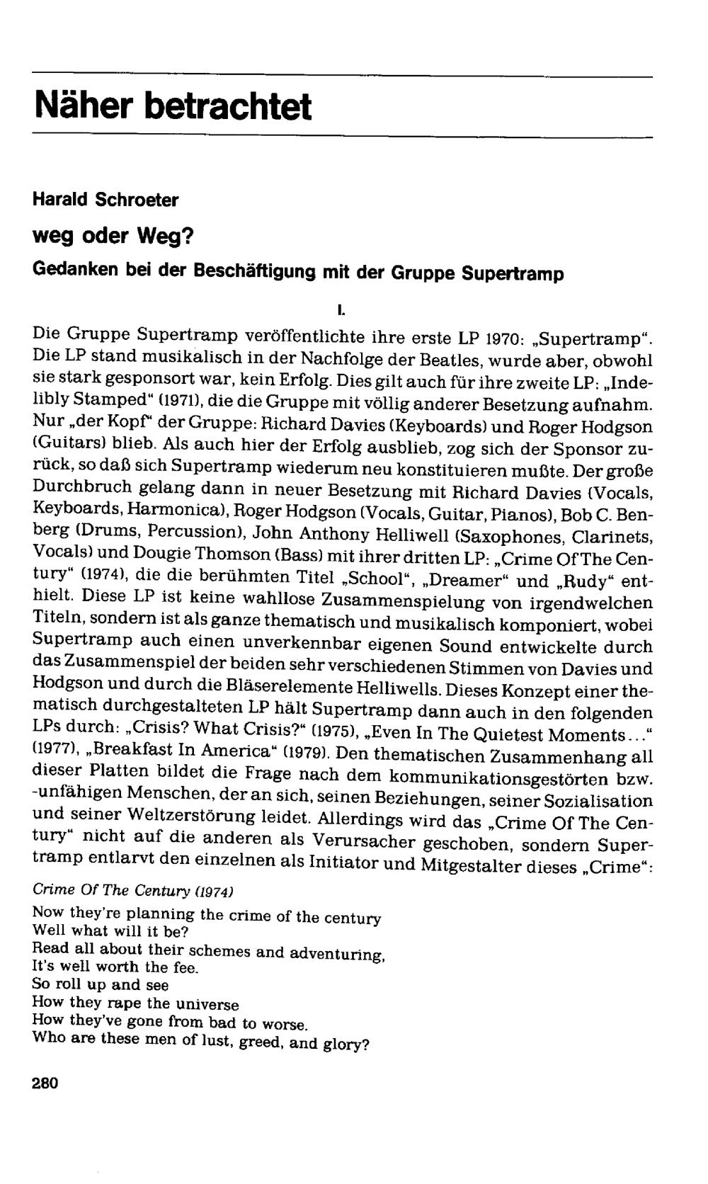 weg oder Weg? : Gedanken bei der Beschäftigung mit der Gruppe Supertramp