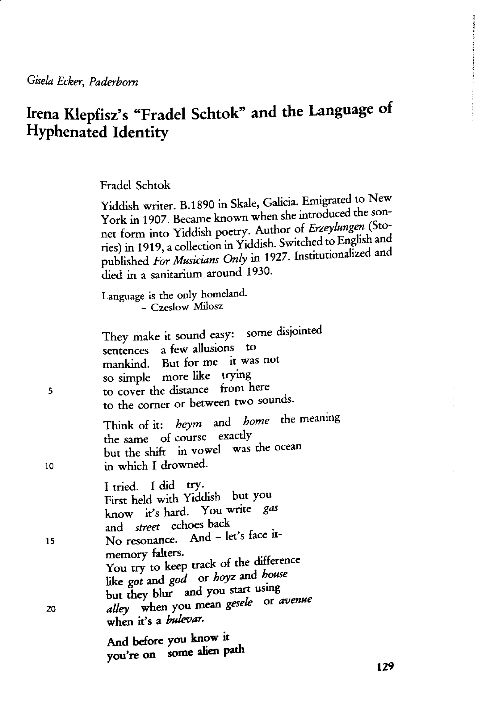 Irena Klepfisz's "Fradel Schtok" and the language of hyphenated identity