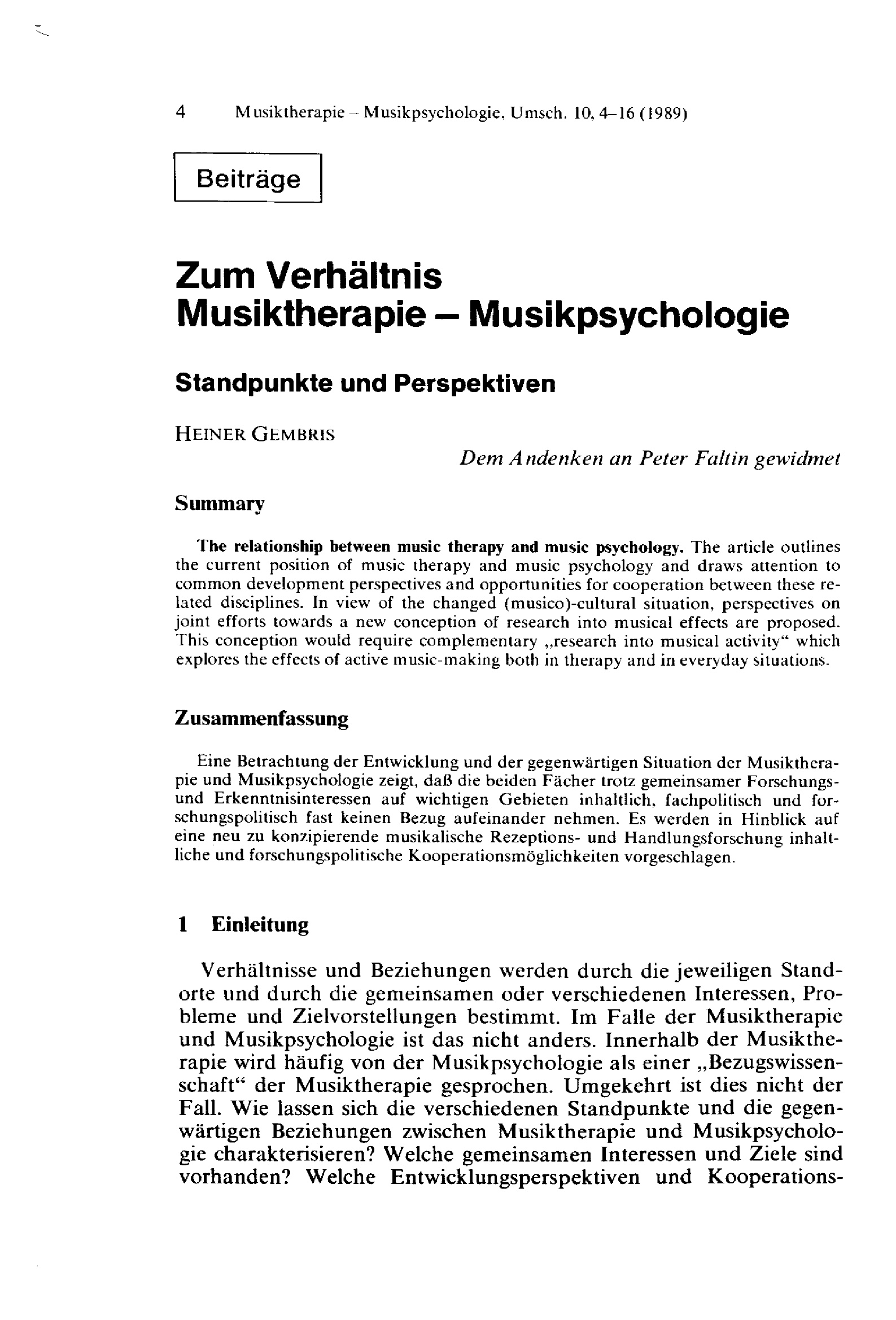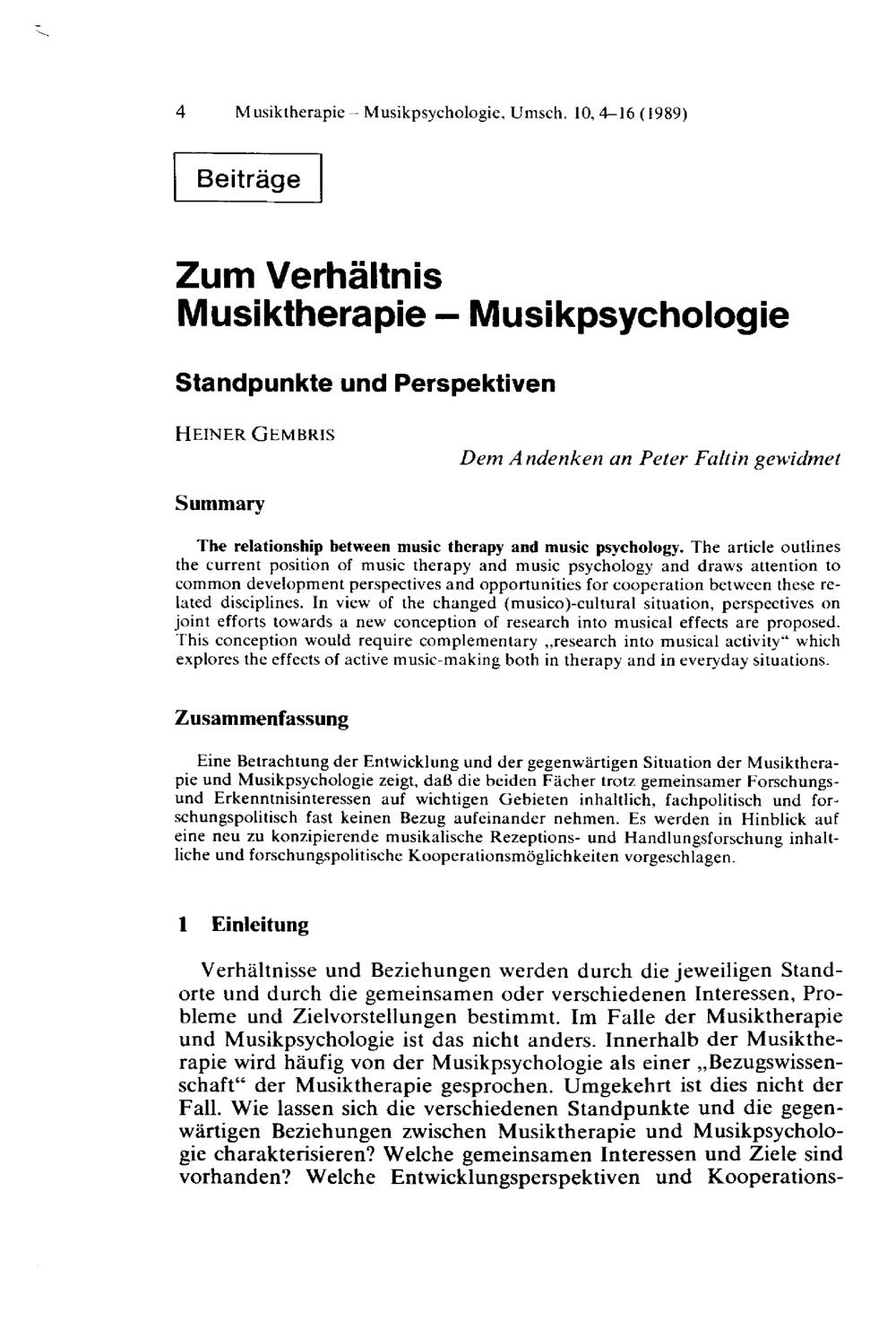 Zum Verhältnis Musiktherapie - Musikpsychologie : Standpunkte und Perspektiven