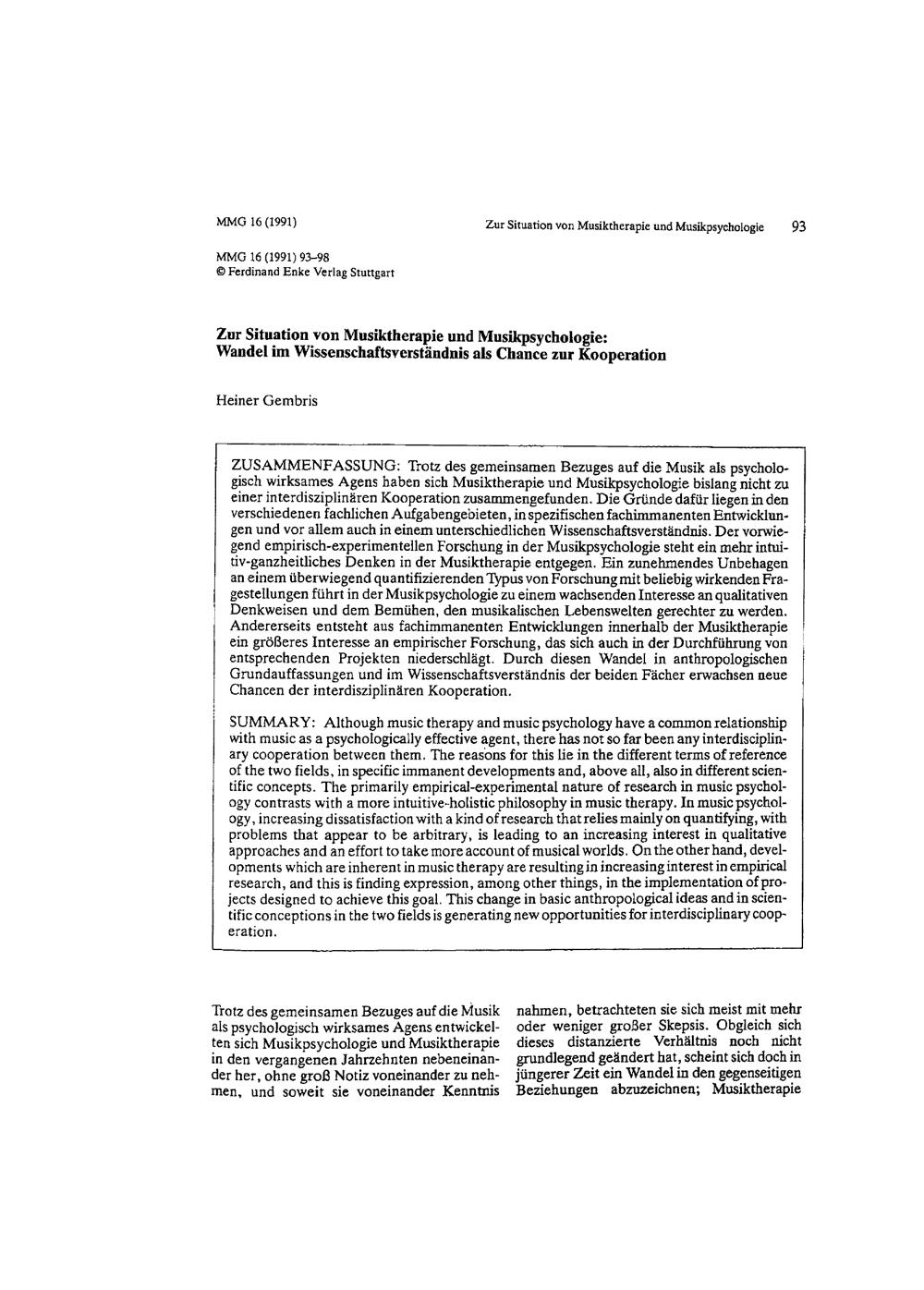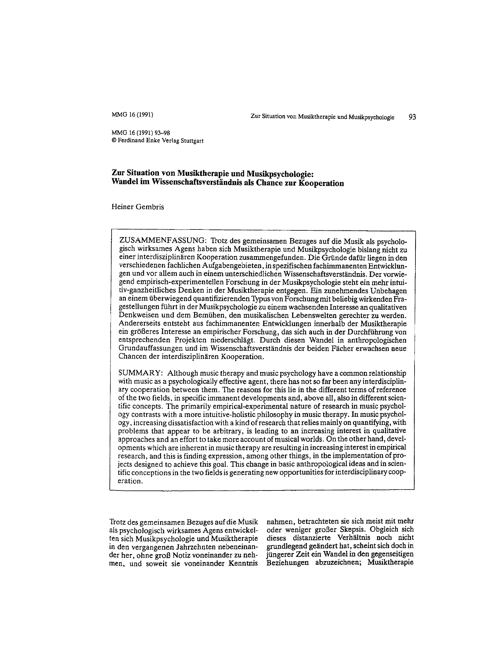 Zur Situation von Musiktherapie und Musikpsychologie : Wandel im Wissenschaftsverständnis als Chance zur Kooperation