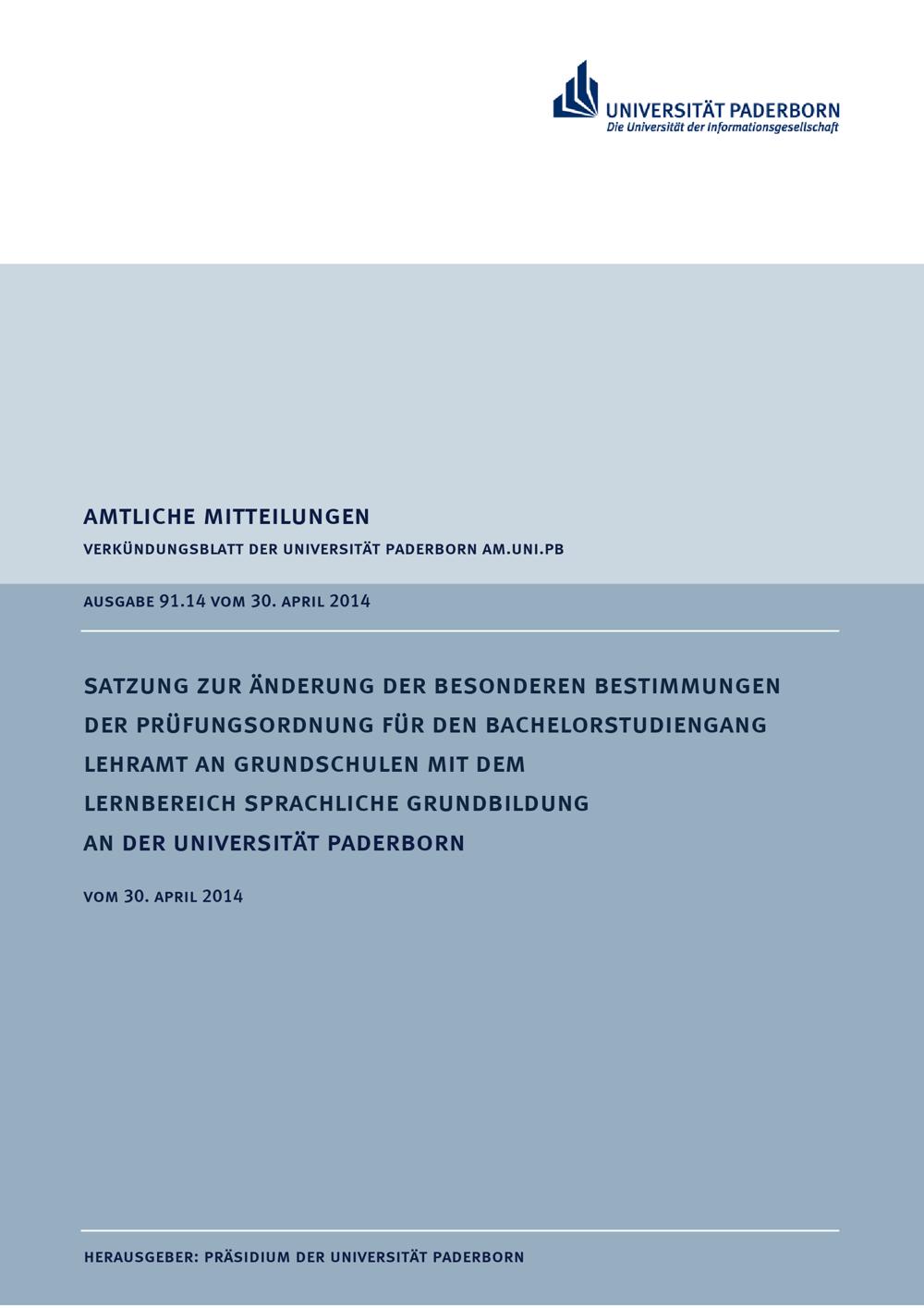 Satzung zur Änderung der besonderen Bestimmungen der Prüfungsordnung für den Bachelorstudiengang Lehramt an Grundschulen mit dem Lernbereich Sprachliche Grundbildung an der Universität Paderborn : vom 30. April 2014