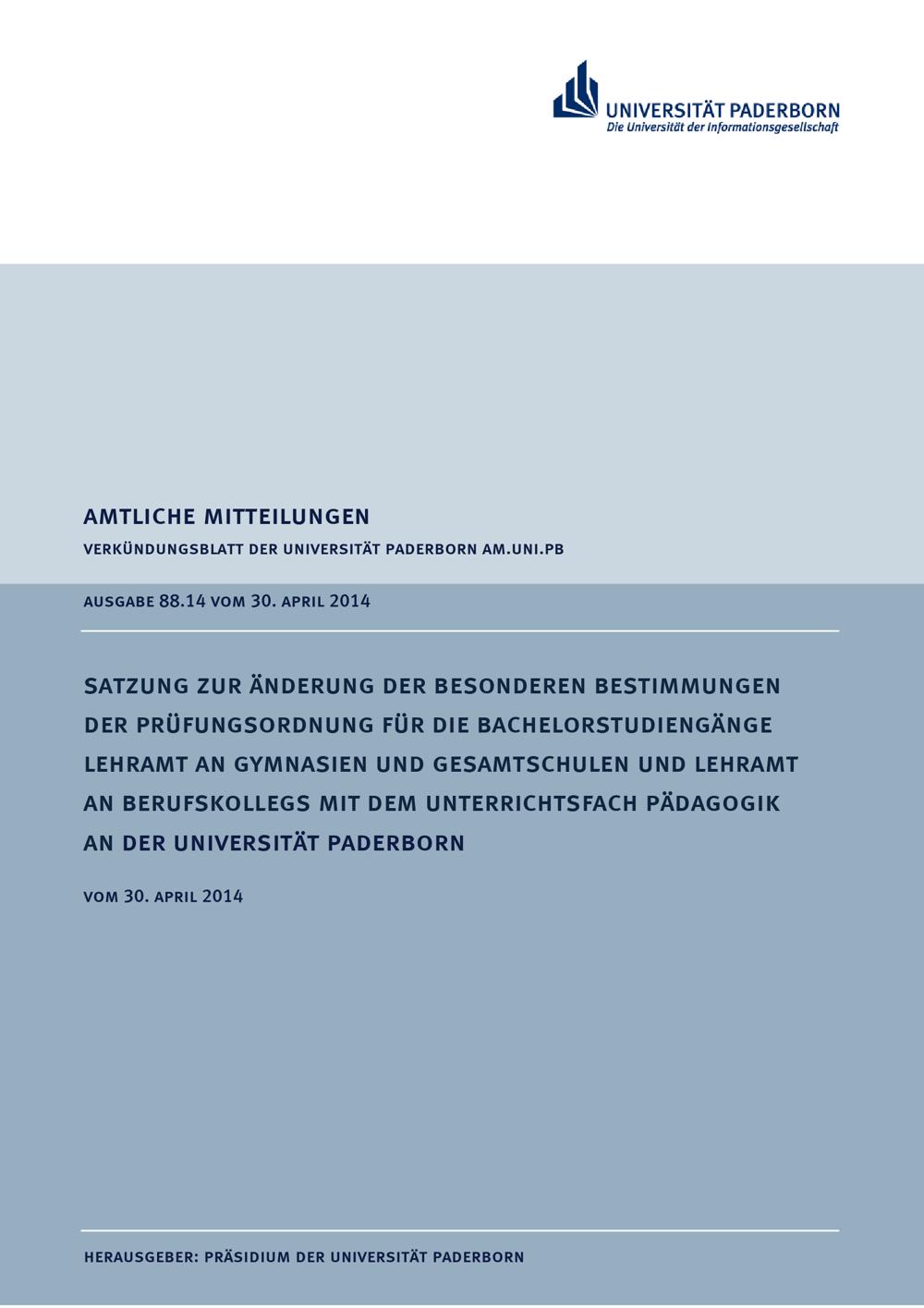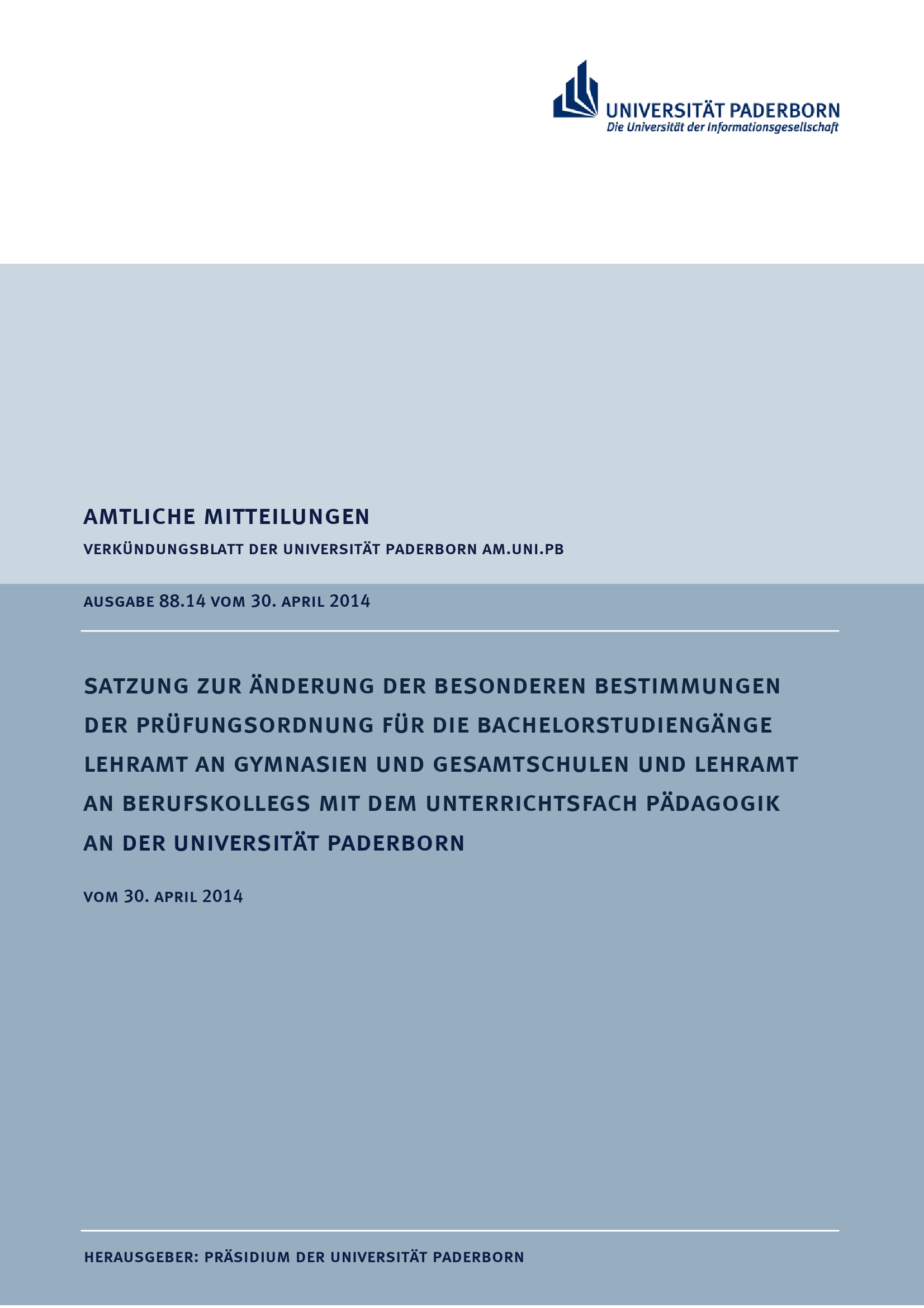 Satzung zur Änderung der besonderen Bestimmungen der Prüfungsordnung für die Bachelorstudiengänge Lehramt an Gymnasien und Gesamtschulen und Lehramt an Berufskollegs mit dem Unterrichtsfach Pädagogik an der Universität Paderborn : vom 30. April 2014