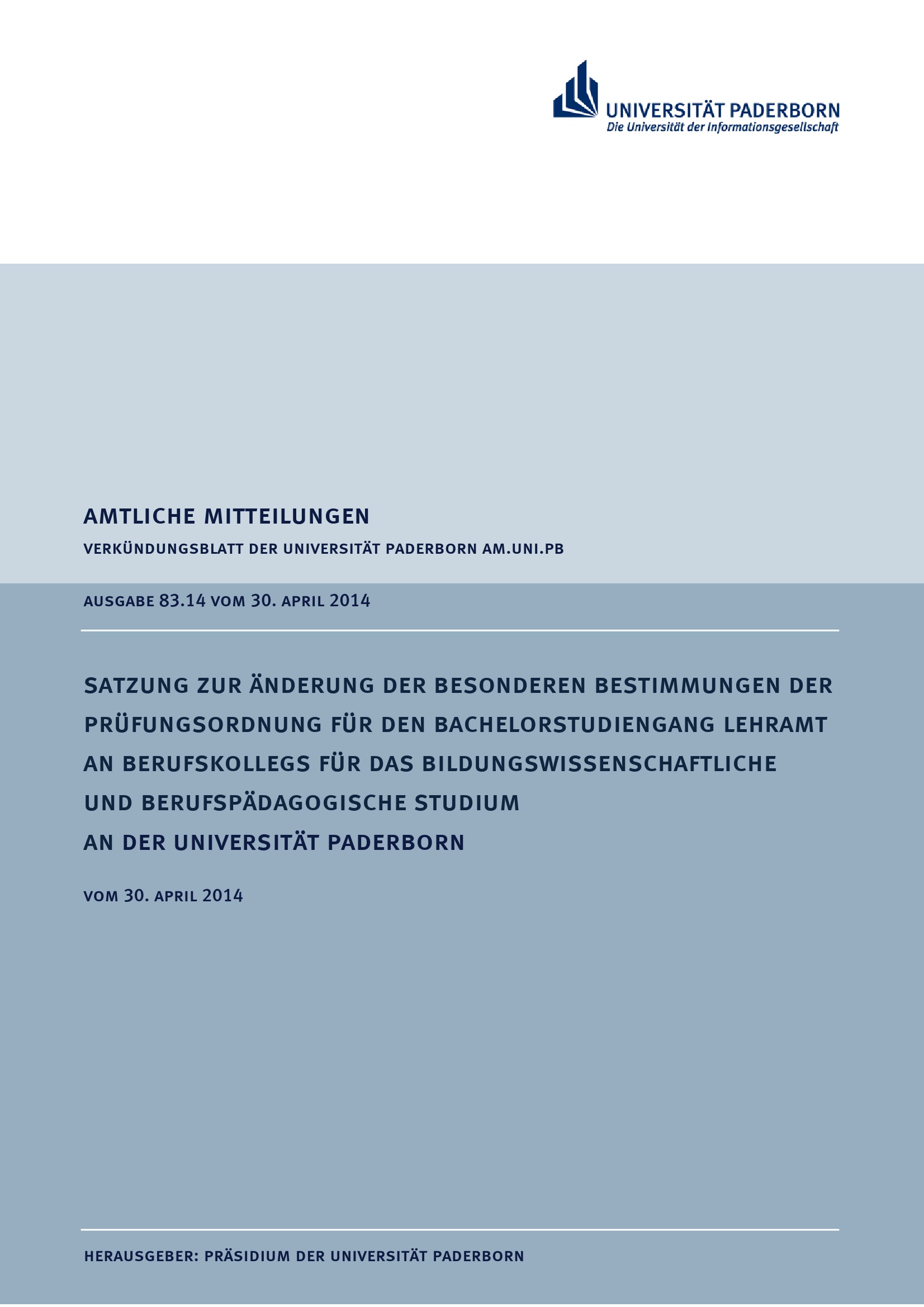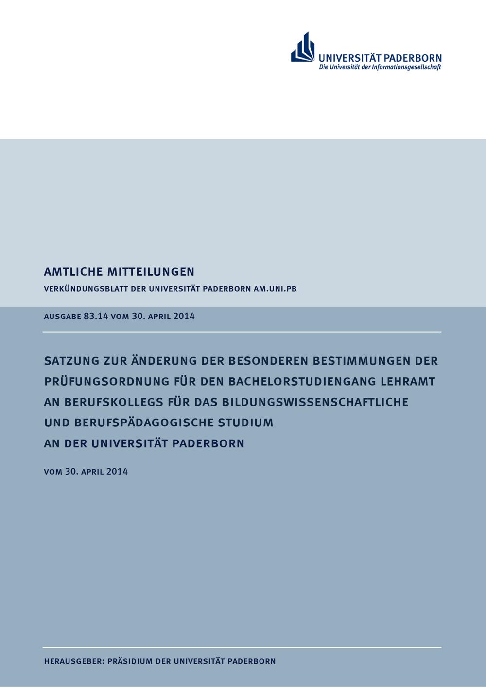 Satzung zur Änderung der besonderen Bestimmungen der Prüfungsordnung für den Bachelorstudiengang Lehramt an Berufskollegs für das bildungswissenschaftliche und berufspädagogische Studium an der Universität Paderborn : vom 30. April 2014