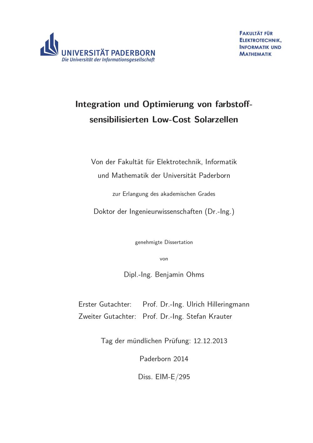 Integration und Optimierung von farbstoffsensibilisierten Low-Cost Solarzellen