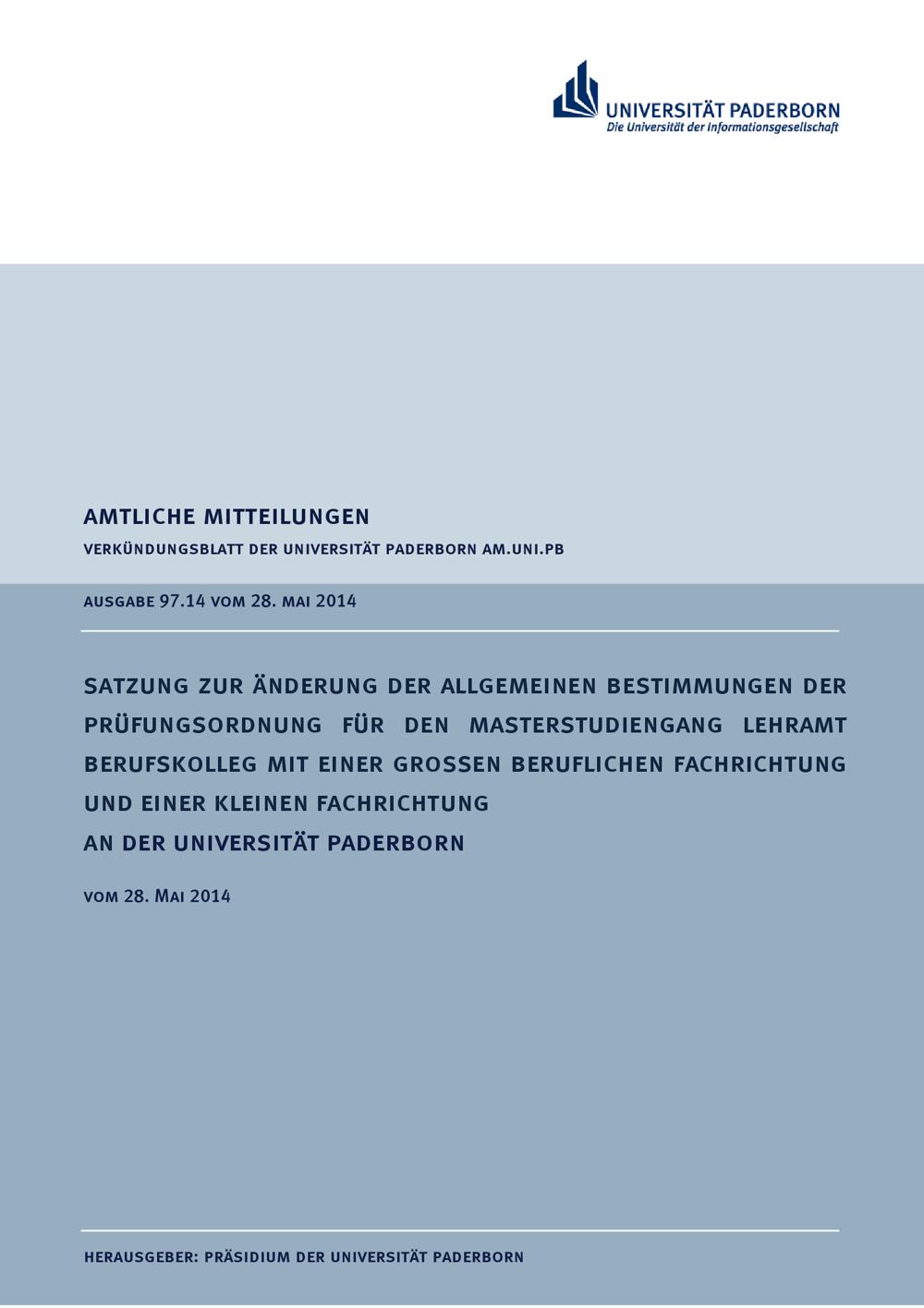 Satzung zur Änderung der allgemeinen Bestimmungen der Prüfungsordnung für den Masterstudiengang Lehramt Berufskolleg mit einer großen beruflichen Fachrichtung und einer kleinen Fachrichtung an der Universität Paderborn : vom 28. Mai 2014