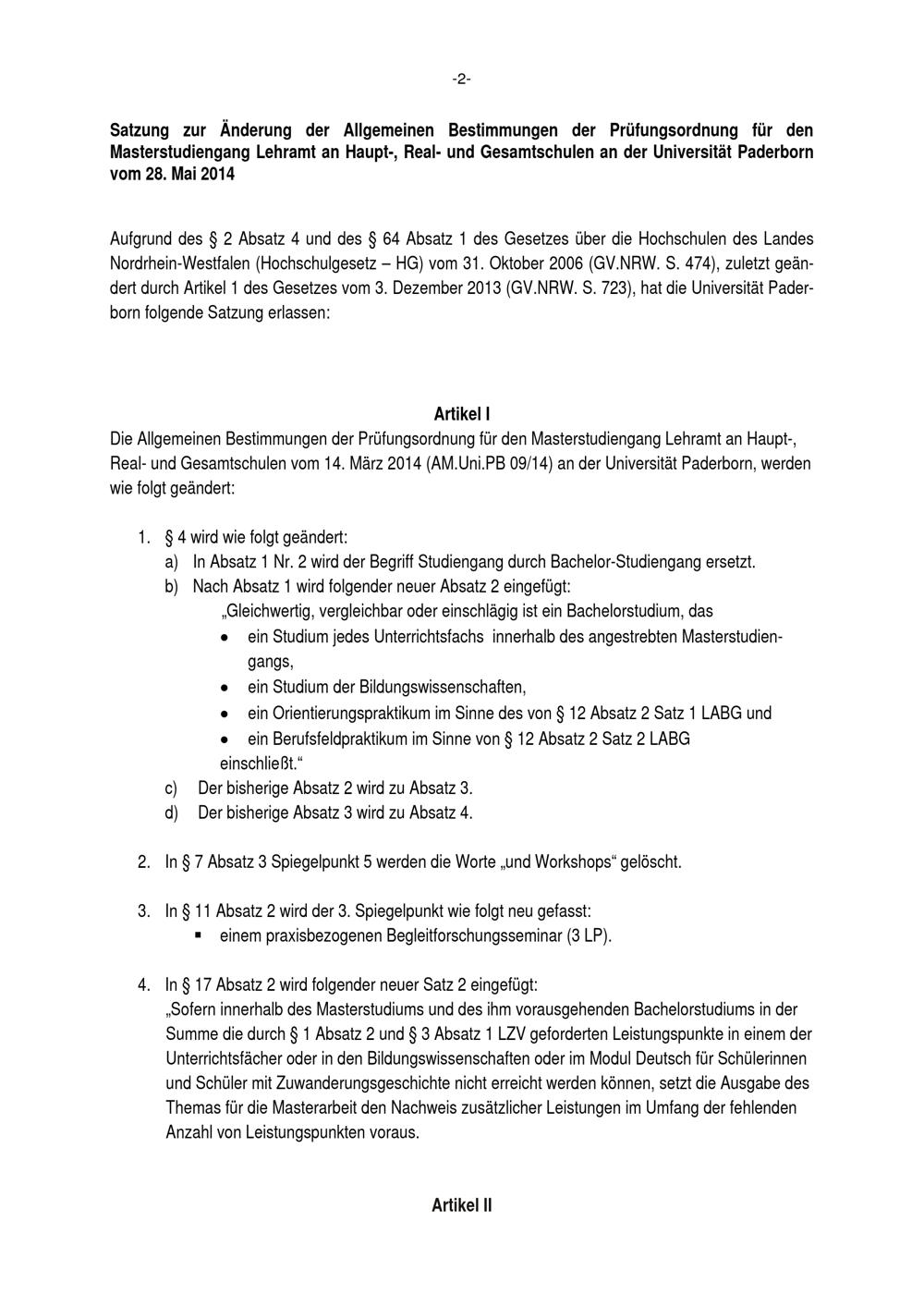 Satzung zur Änderung der allgemeinen Bestimmungen der Prüfungsordnung für den Masterstudiengang Lehramt an Haupt-, Real- und Gesamtschulen an der Universität Paderborn : vom 28. Mai 2014