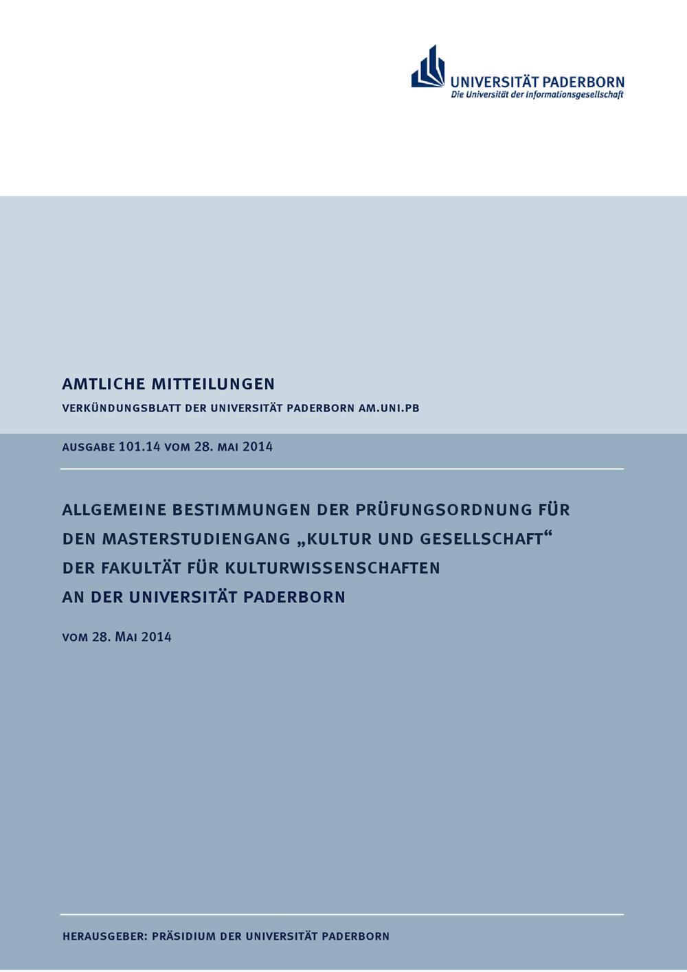 Allgemeine Bestimmungen der Prüfungsordnung für den Masterstudiengang „Kultur und Gesellschaft“ der Fakultät für Kulturwissenschaften an der Universität Paderborn : vom 28. Mai 2014