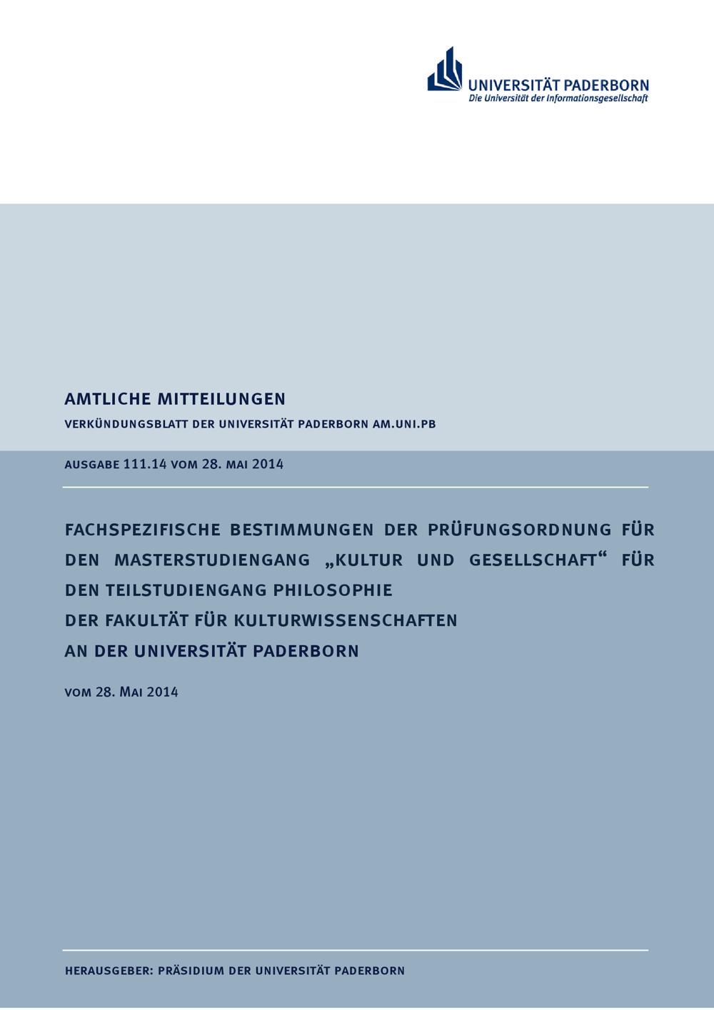 Fachspezifische Bestimmungen der Prüfungsordnung für den Masterstudiengang „Kultur und Gesellschaft“ für den Teilstudiengang Philosophie der Fakultät für Kulturwissenschaften an der Universität Paderborn : vom 28. Mai 2014