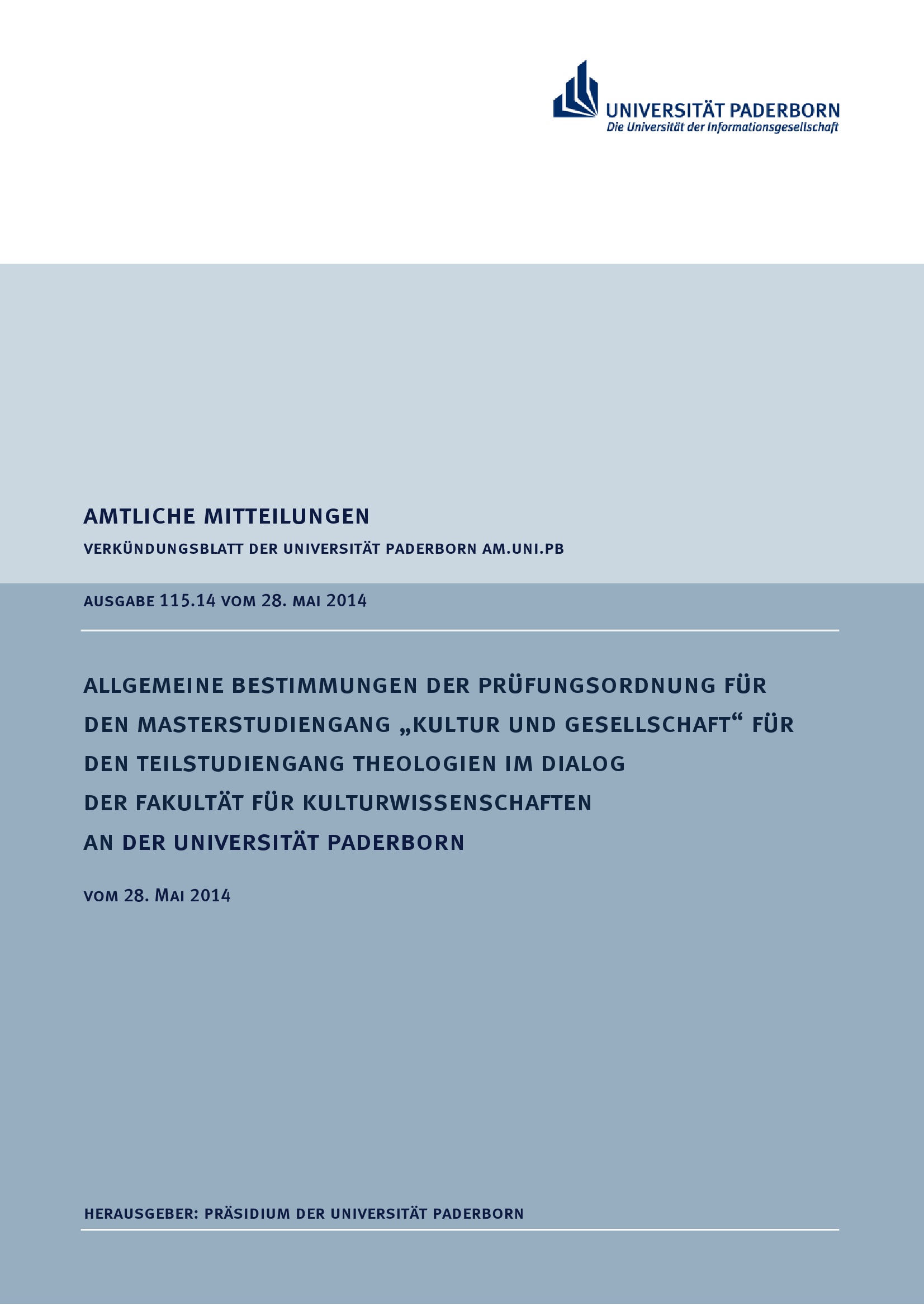 Allgemeine Bestimmungen der Prüfungsordnung für den Masterstudiengang „Kultur und Gesellschaft“ für den Teilstudiengang Theologien im Dialog der Fakultät für Kulturwissenschaften an der Universität Paderborn : vom 28. Mai 2014