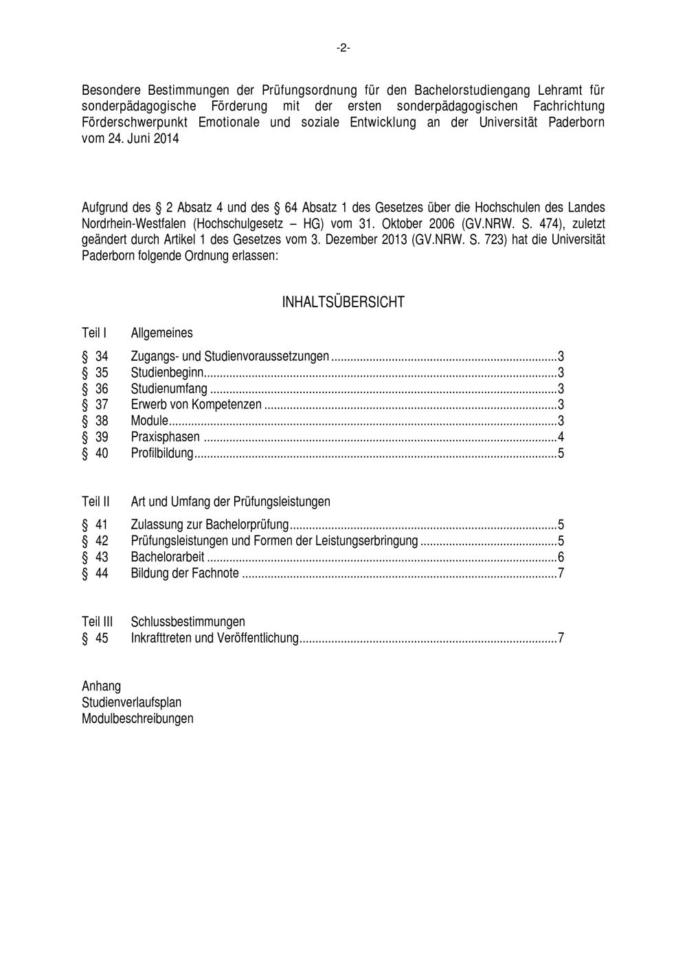 Besondere Bestimmungen der Prüfungsordnung für den Bachelorstudiengang Lehramt für sonderpädagogische Förderung mit der ersten sonderpädagogischen Fachrichtung Förderschwerpunkt emotionale und soziale Entwicklung an der Universität Paderborn : vom 24. Juni 2014