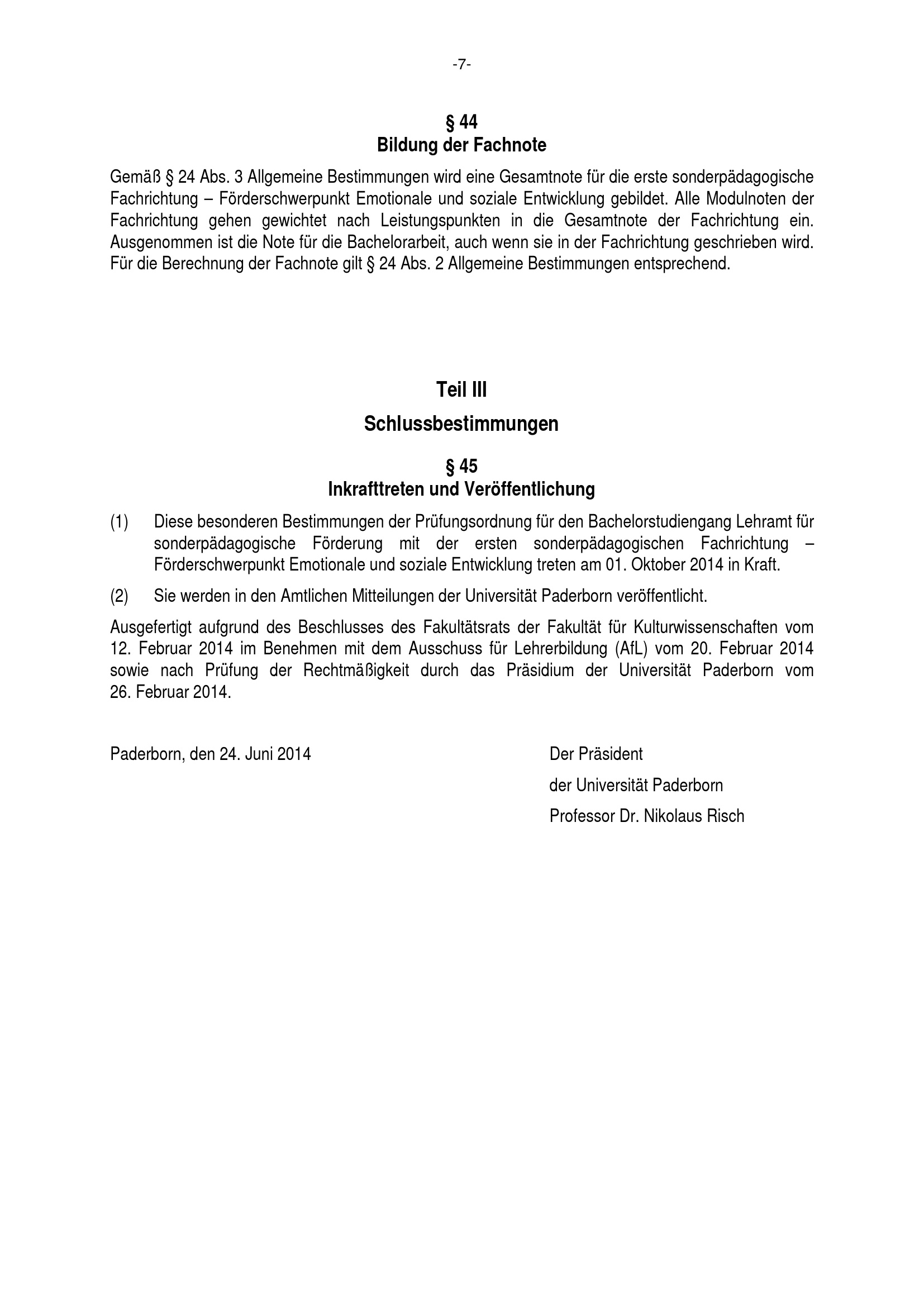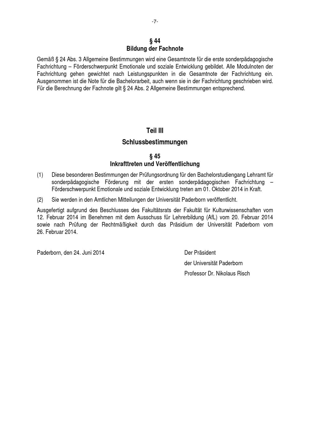 Besondere Bestimmungen der Prüfungsordnung für den Bachelorstudiengang Lehramt für sonderpädagogische Förderung mit der ersten sonderpädagogischen Fachrichtung Förderschwerpunkt emotionale und soziale Entwicklung an der Universität Paderborn : vom 24. Juni 2014