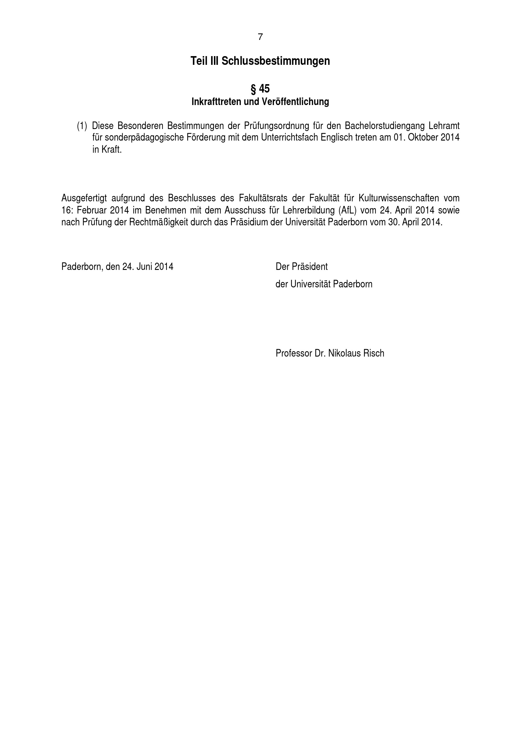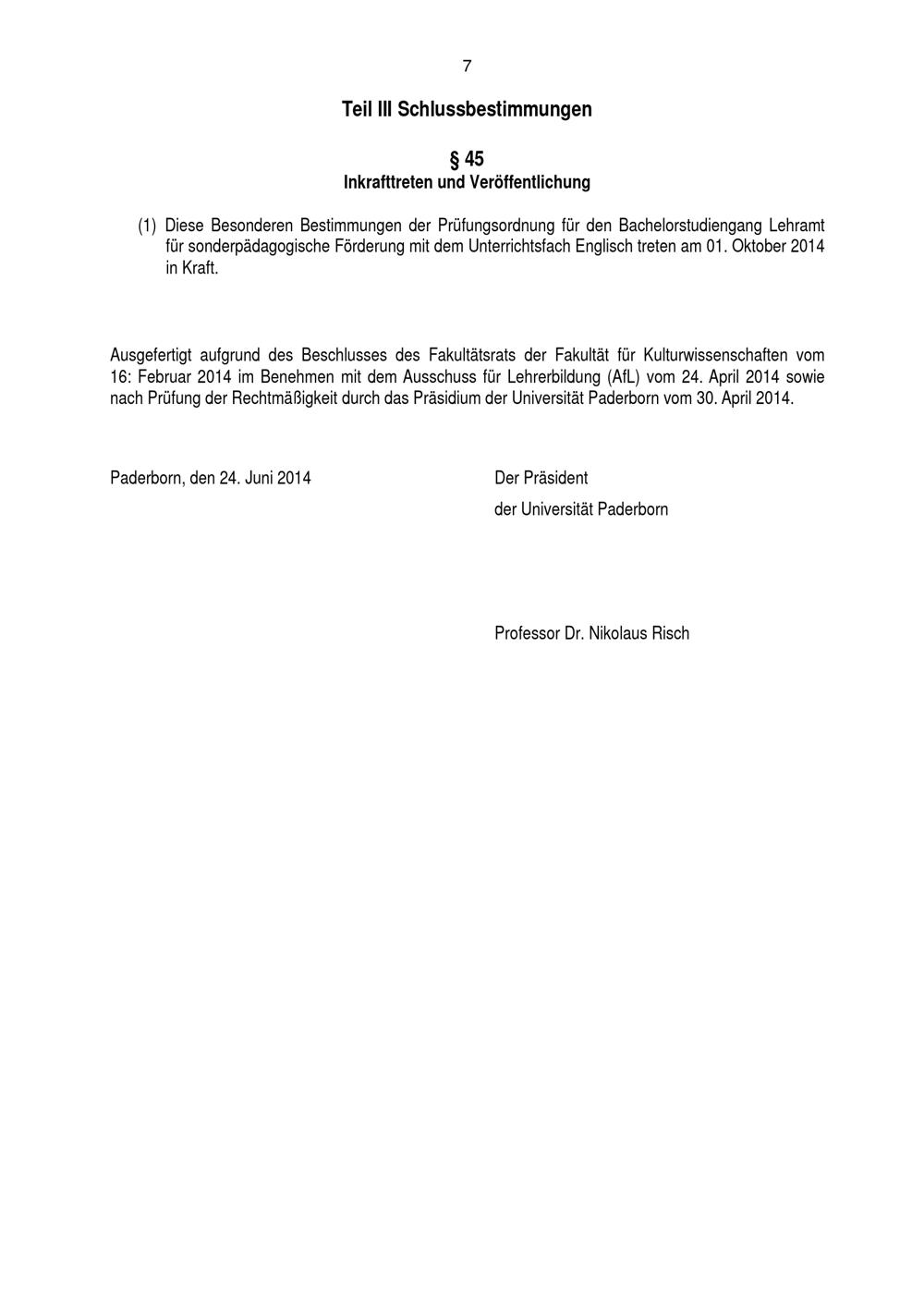 Besondere Bestimmungen der Prüfungsordnung für den Bachelorstudiengang Lehramt für sonderpädagogische Förderung mit dem Unterrichtsfach Englisch an der Universität Paderborn : vom 24. Juni 2014