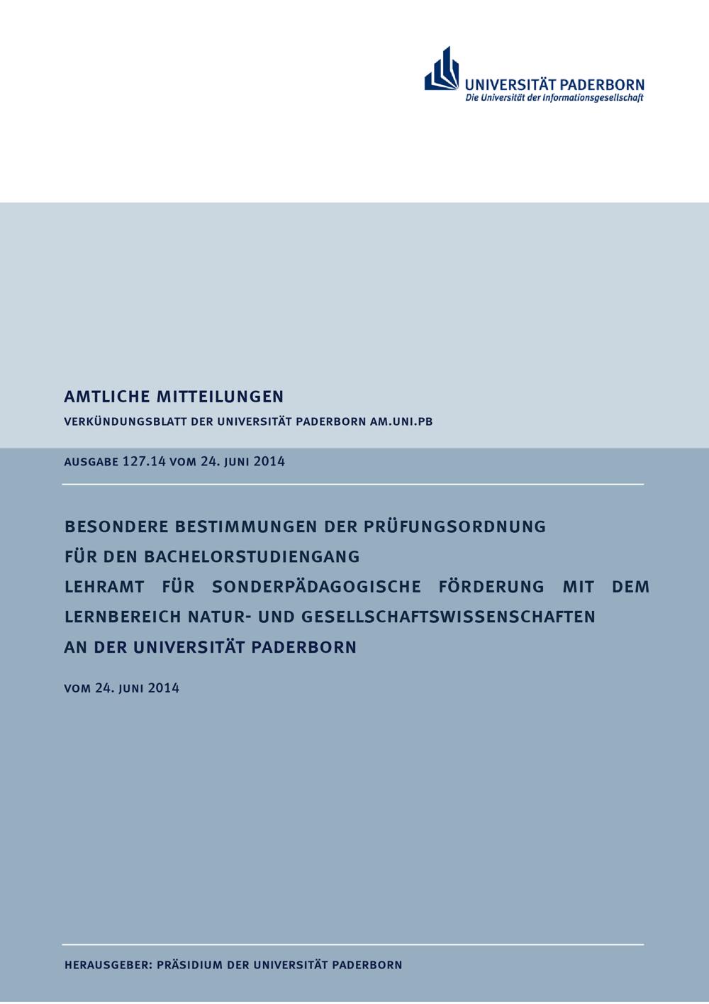 Besondere Bestimmungen der Prüfungsordnung für den Bachelorstudiengang Lehramt für sonderpädagogische Förderung mit dem Lernbereich Natur- und Gesellschaftswissenschaften an der Universität Paderborn : vom 24. Juni 2014