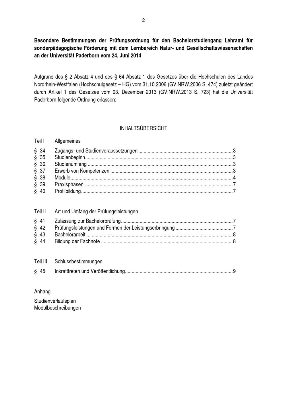 Besondere Bestimmungen der Prüfungsordnung für den Bachelorstudiengang Lehramt für sonderpädagogische Förderung mit dem Lernbereich Natur- und Gesellschaftswissenschaften an der Universität Paderborn : vom 24. Juni 2014