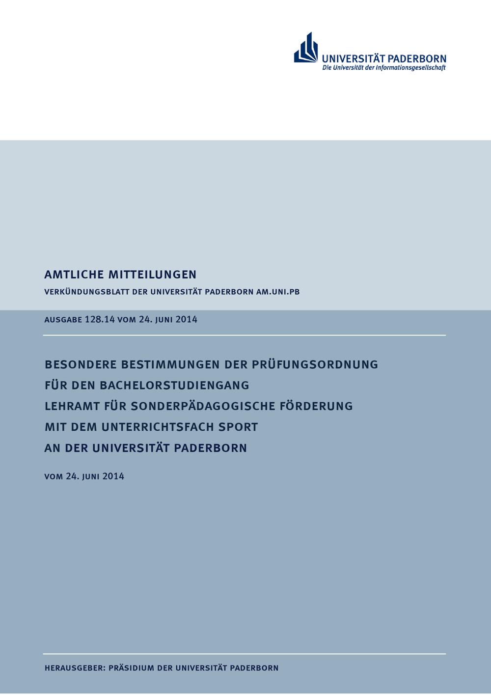 Besondere Bestimmungen der Prüfungsordnung für den Bachelorstudiengang Lehramt für sonderpädagogische Förderung mit dem Unterrichtsfach Sport an der Universität Paderborn : vom 24. Juni 2014