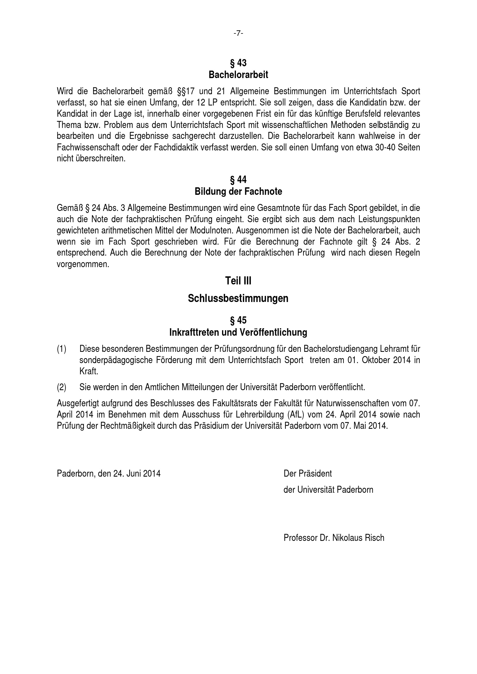 Besondere Bestimmungen der Prüfungsordnung für den Bachelorstudiengang Lehramt für sonderpädagogische Förderung mit dem Unterrichtsfach Sport an der Universität Paderborn : vom 24. Juni 2014