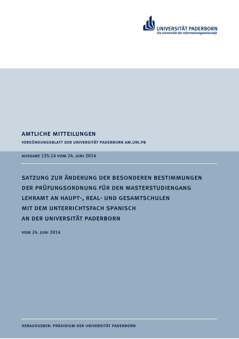 Satzung zur Änderung der besonderen Bestimmungen der Prüfungsordnung für den Masterstudiengang Lehramt an Haupt-, Real- und Gesamtschulen mit dem Unterrichtsfach Spanisch an der Universität Paderborn : vom 24. Juni 2014
