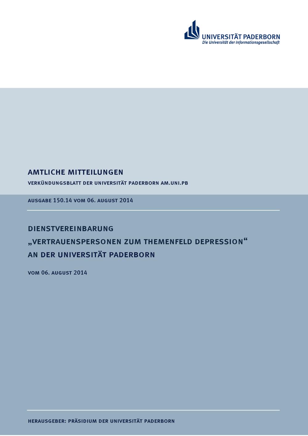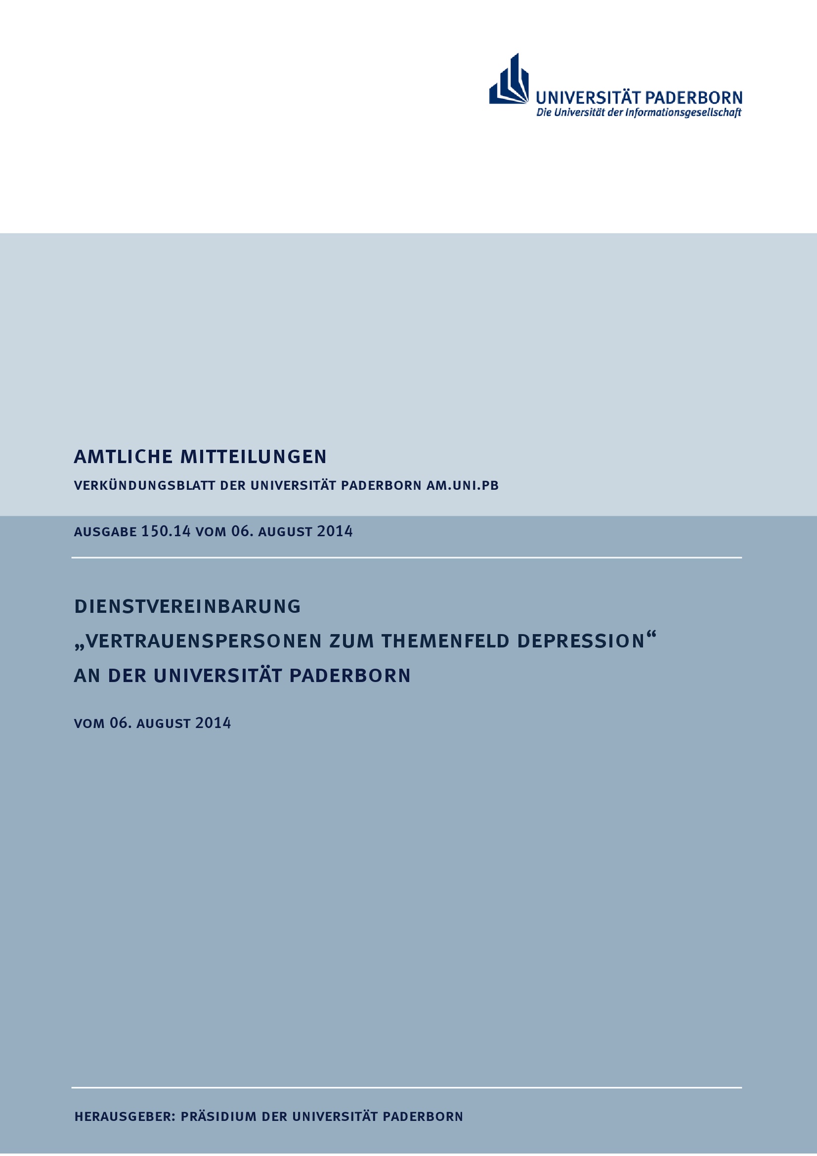 Dienstvereinbarung „Vertrauenspersonen zum Themenfeld Depression“ an der Universität Paderborn : vom 06. August 2014