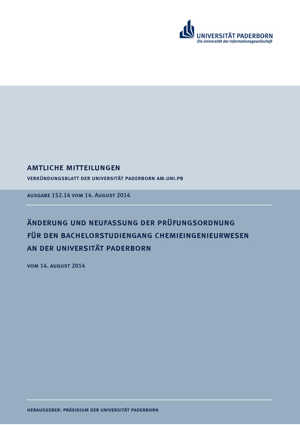 Änderung und Neufassung der Prüfungsordnung für den Bachelorstudiengang Chemieingenieurwesen an der Universität Paderborn : vom 14. August 2014