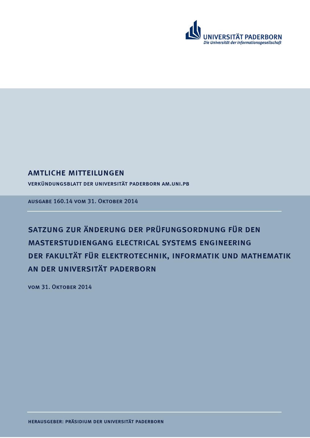 Satzung zur Änderung der Prüfungsordnung für den Masterstudiengang Electrical Systems Engineering der Fakultät für Elektrotechnik, Informatik und Mathematik an der Universität Paderborn : vom 31. Oktober 2014