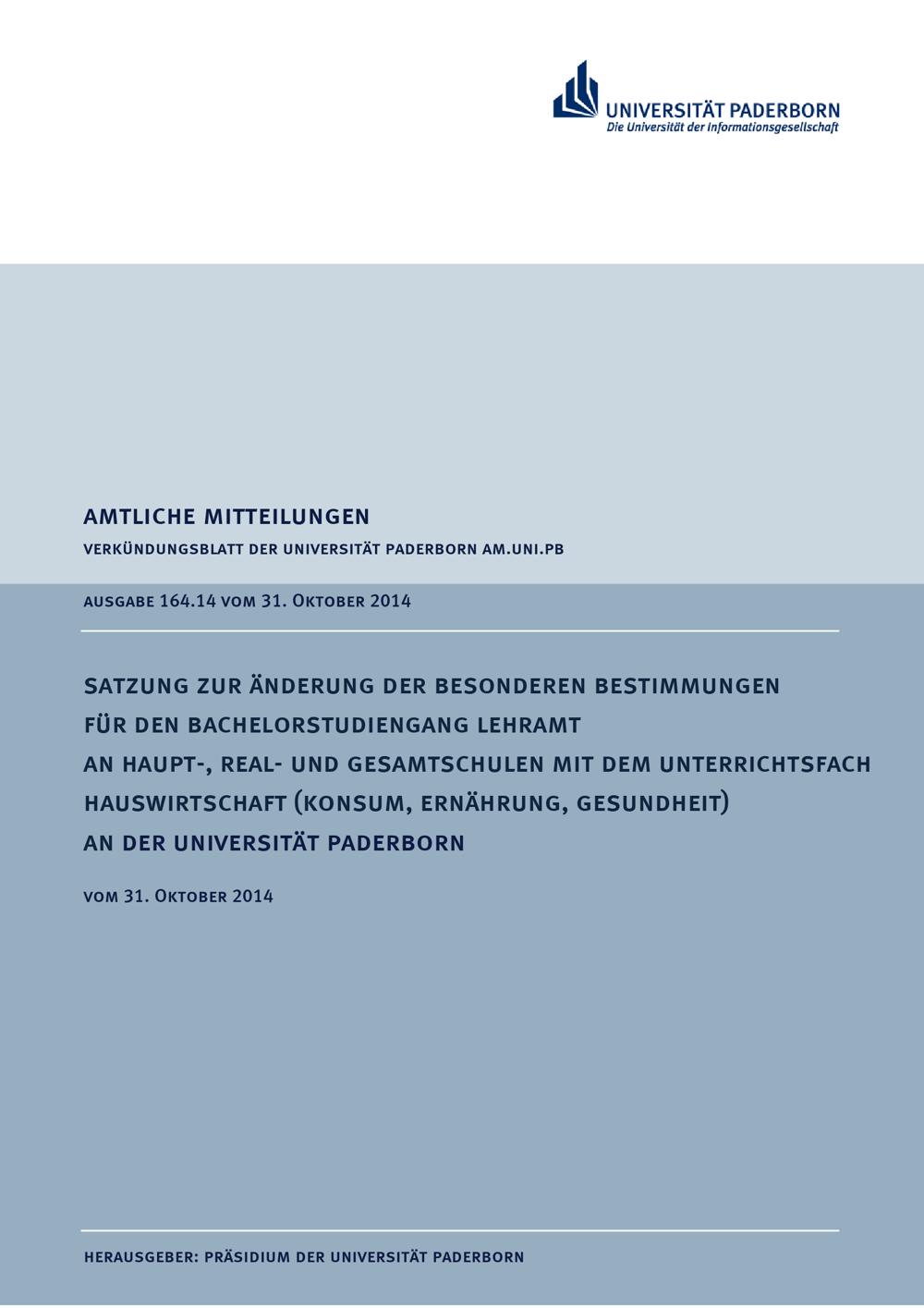 Satzung zur Änderung der besonderen Bestimmungen für den Bachelorstudiengang Lehramt an Haupt-, Real- und Gesamtschulen mit dem Unterrichtsfach Hauswirtschaft (Konsum, Ernährung, Gesundheit) an der Universität Paderborn : vom 31. Oktober 2014