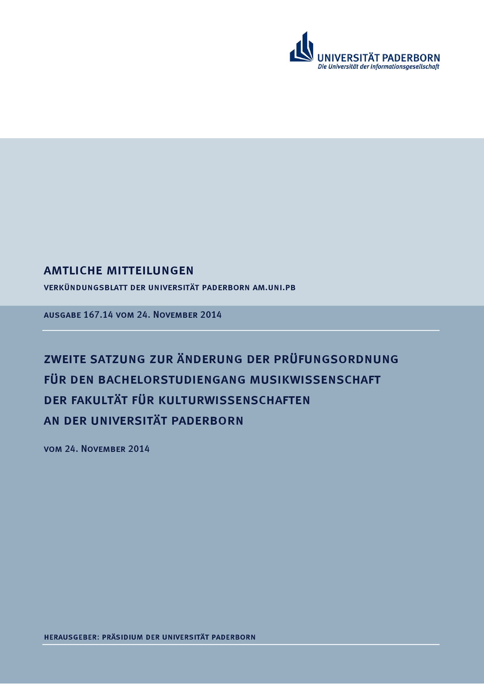 Zweite Satzung zur Änderung der Prüfungsordnung für den Bachelorstudiengang Musikwissenschaft der Fakultät für Kulturwissenschaften an der Universität Paderborn : vom 24. November 2014