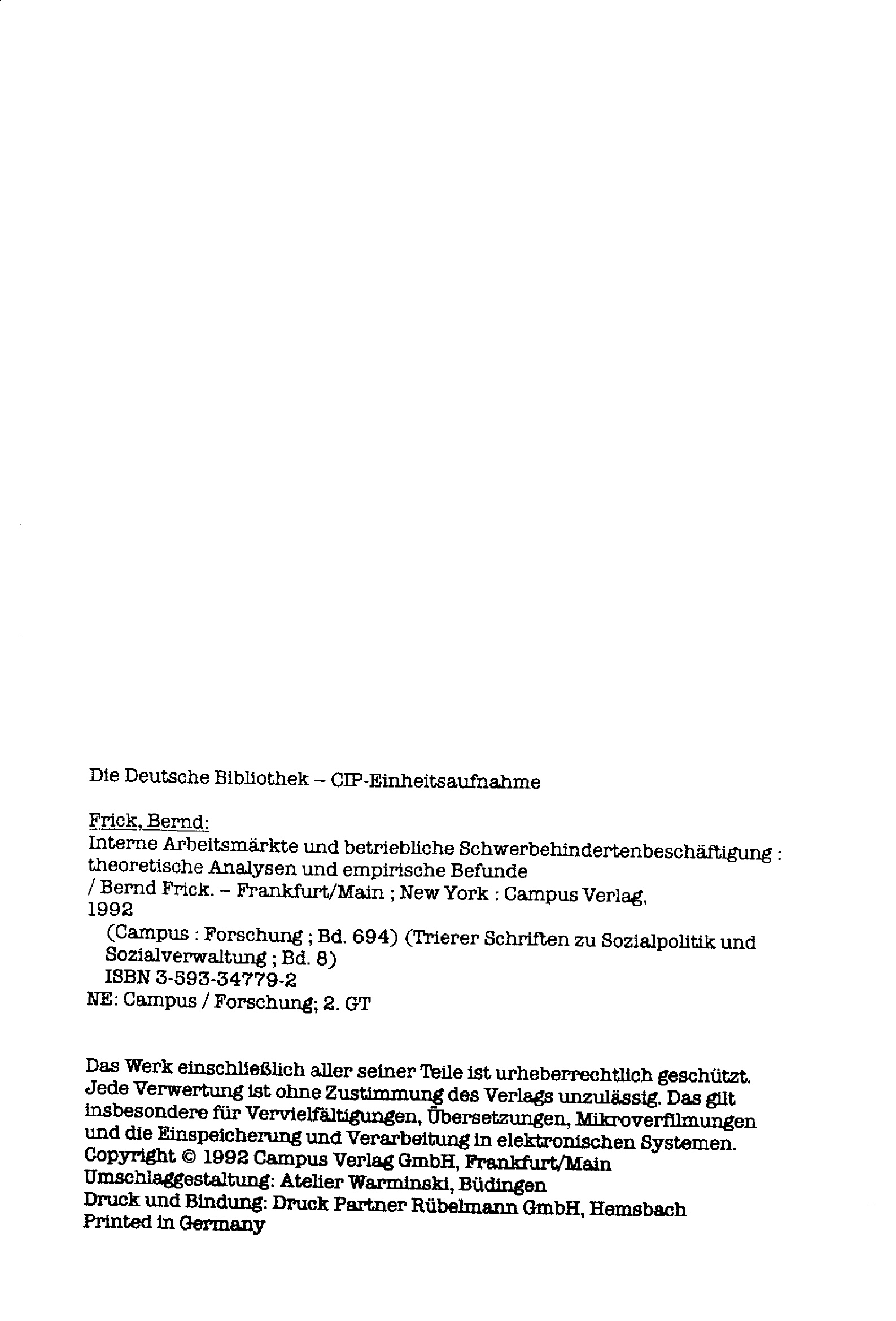 Interne Arbeitsmärkte und betriebliche Schwerbehindertenbeschäftigung : theoretische Analysen und empirische Befunde