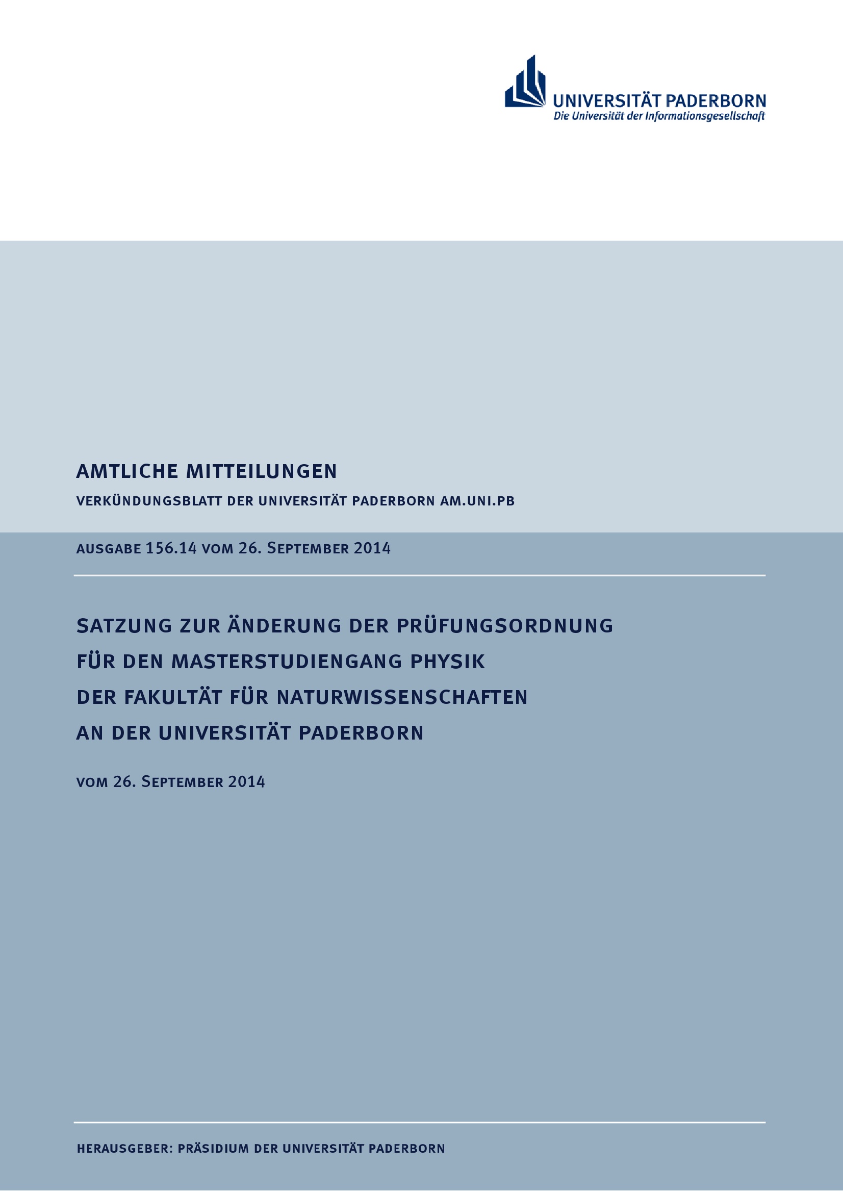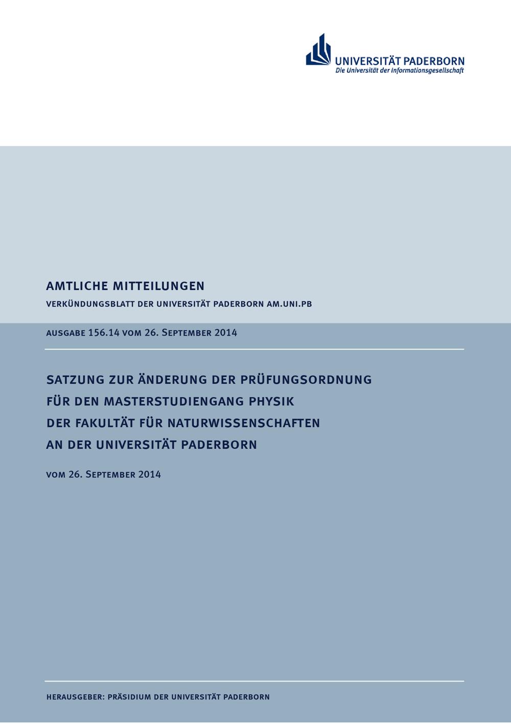 Satzung zur Änderung der Prüfungsordnung für den Masterstudiengang Physik der Fakultät für Naturwissenschaften an der Universität Paderborn : vom 26. September 2014