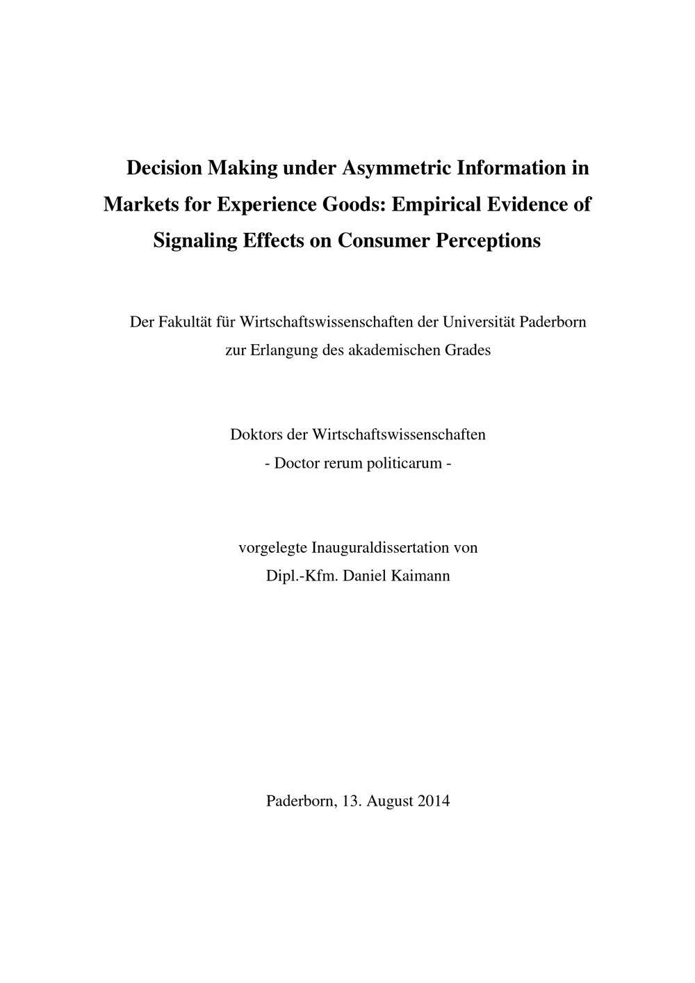 Decision making under asymmetric information in markets for experience goods : empirical evidence of signaling effects on consumer perceptions