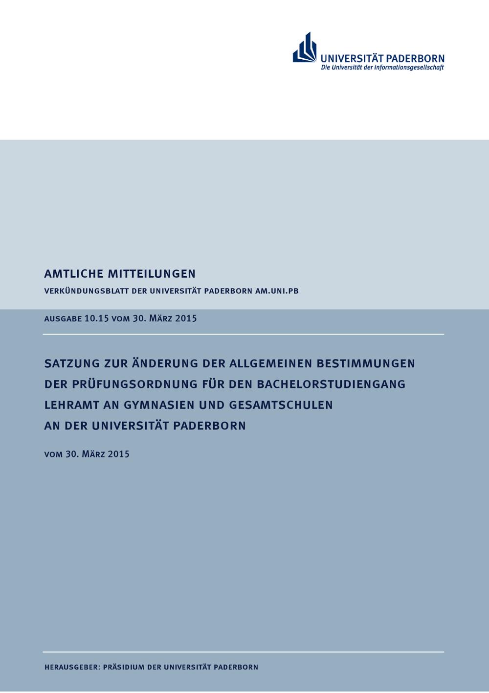 Satzung zur Änderung der allgemeinen Bestimmungen der Prüfungsordnung für den Bachelorstudiengang Lehramt an Gymnasien und Gesamtschulen an der Universität Paderborn : vom 30. März 2015