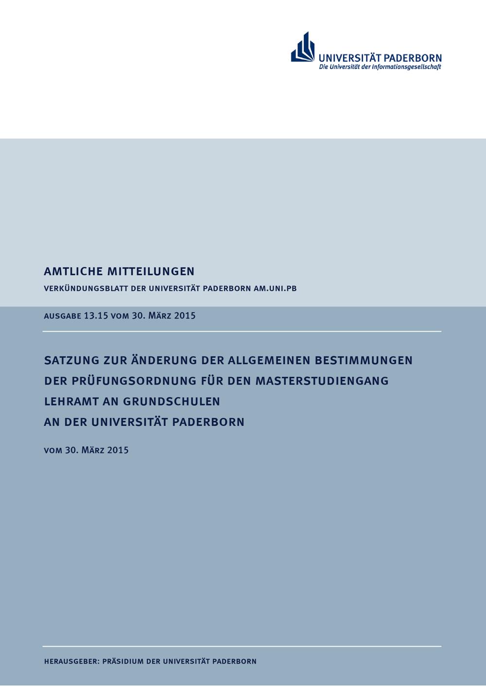 Satzung zur Änderung der allgemeinen Bestimmungen der Prüfungsordnung für den Masterstudiengang Lehramt an Grundschulen an der Universität Paderborn : vom 30. März 2015