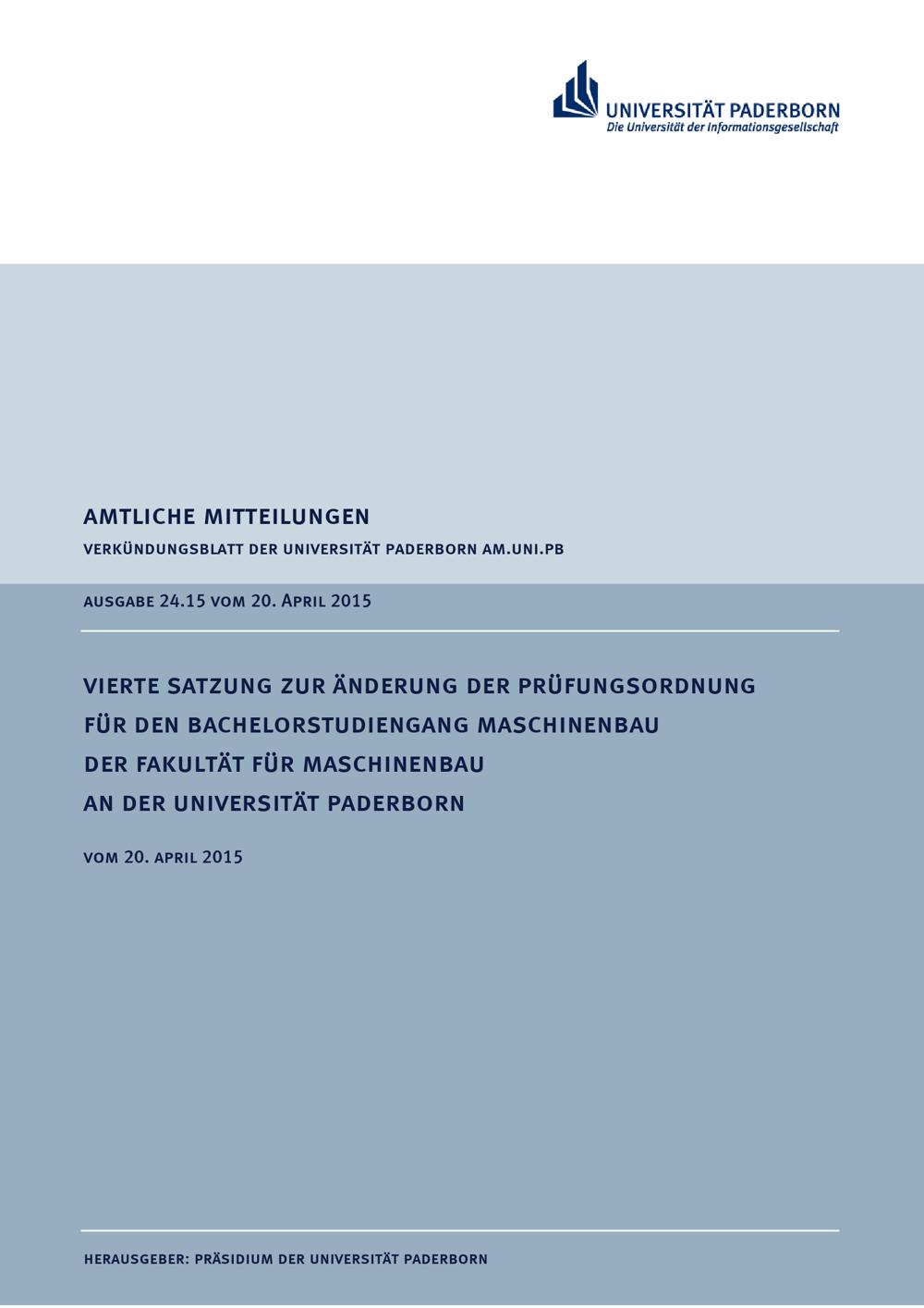 Vierte satzung zur Änderung der Prüfungsordnung für den Bachelorstudiengang Maschinenbau der Fakultät für Maschinenbau an der Universität Paderborn : vom 20. April 2015