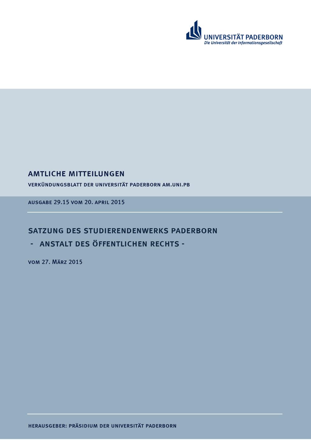 Satzung des Studierendenwerks Paderborn - Anstalt des Öffentlichen Rechts : vom 27. März 2015