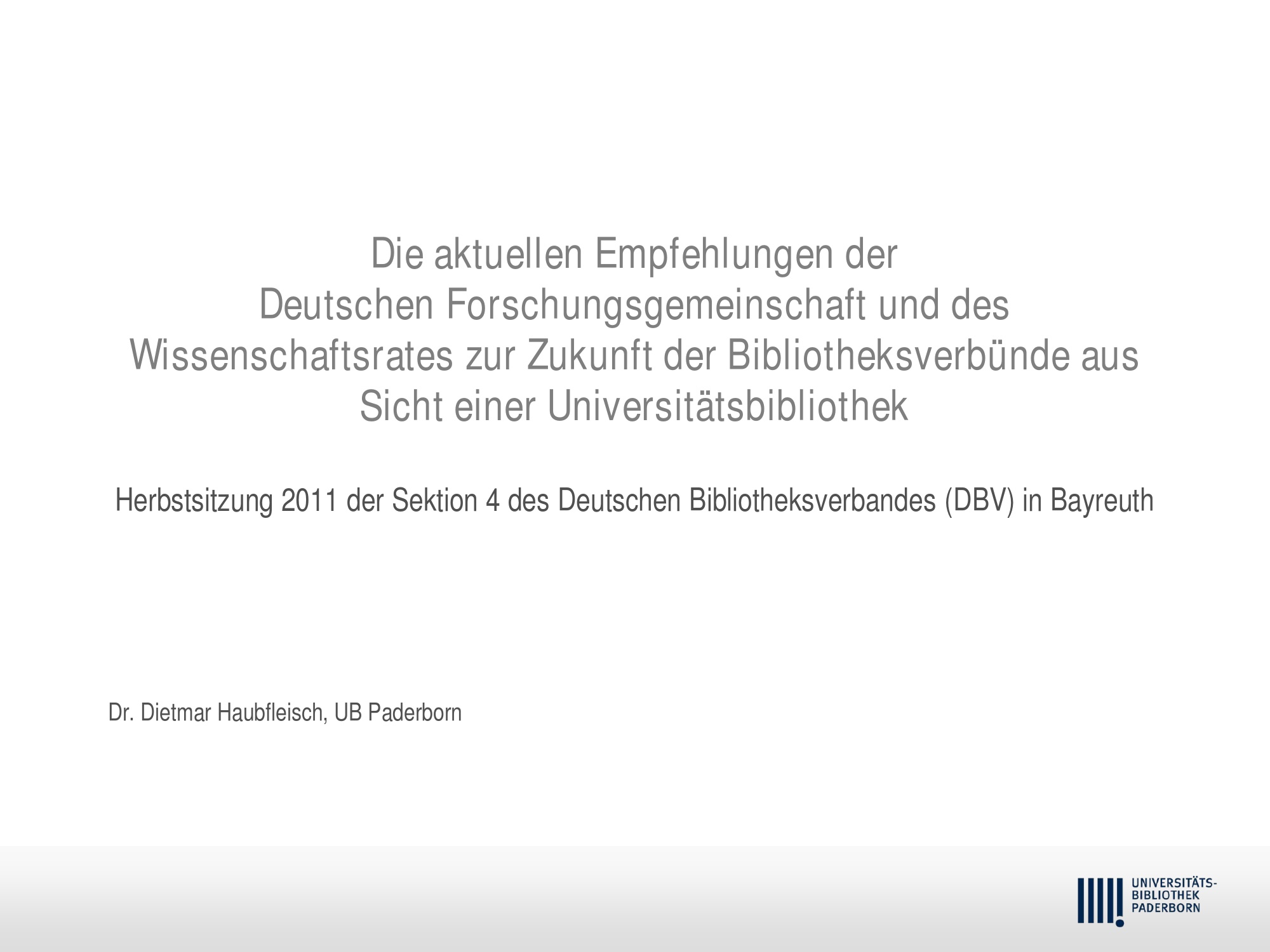 Die aktuellen Empfehlungen der Deutschen Forschungsgemeinschaft und des Wissenschaftsrates zur Zukunft der Bibliotheksverbünde aus Sicht einer Universitätsbibliothek : Vortrag auf der Herbstsitzung der Sektion 4 des Deutschen Bibliotheksverbandes (DBV) in Bayreuth, 26.10.2011