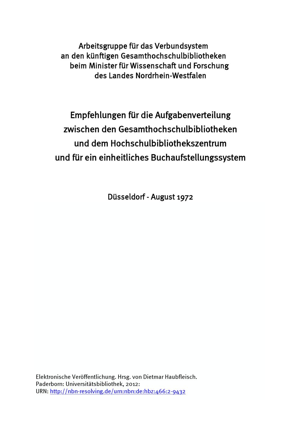 Empfehlungen für die Aufgabenverteilung zwischen den Gesamthochschulbibliotheken und dem Hochschulbibliothekszentrum und für ein einheitliches Buchaufstellungssystem : Düsseldorf, August 1972 / Arbeitsgruppe für das Verbundsystem an den künftigen Gesamthochschulbibliotheken beim Minister für Wissenschaft und Forschung des Landes Nordrhein-Westfalen. Hrsg. von Dietmar Haubfleisch