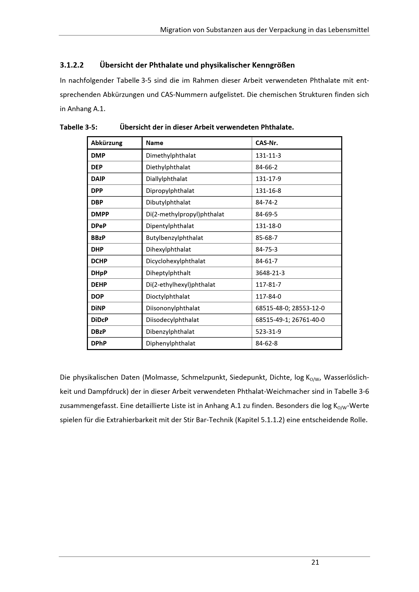 3.1.2.2 Übersicht der Phthalate und physikalischer Kenngrößen