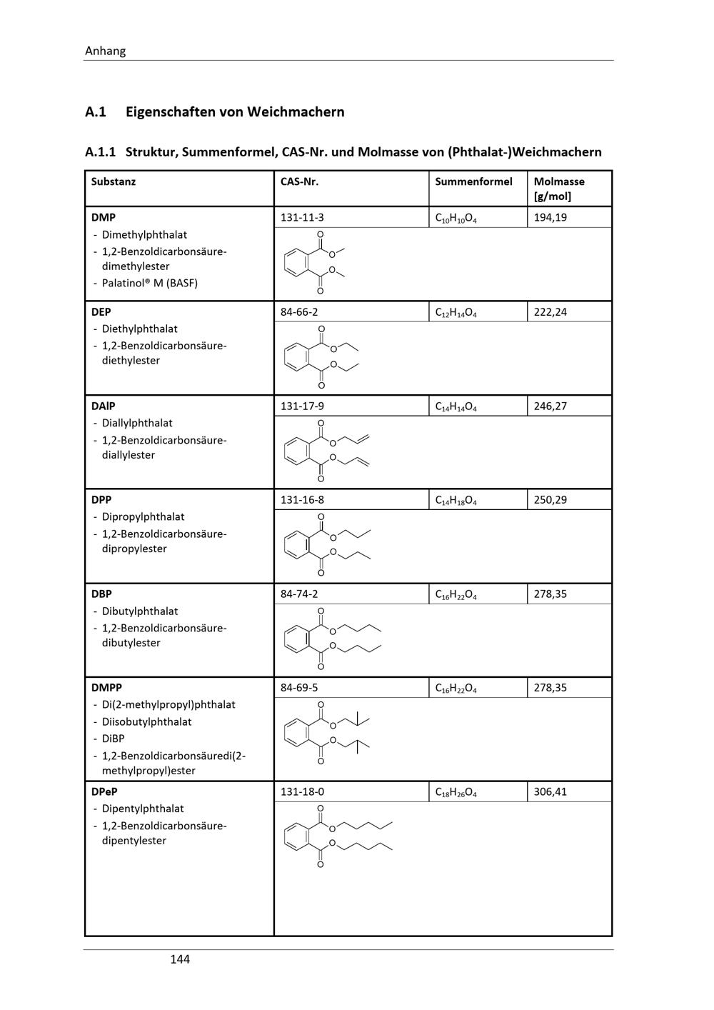 A.1.1 Struktur, Summenformel, CAS-Nr. und Molmasse von (Phthalat-)Weichmachern