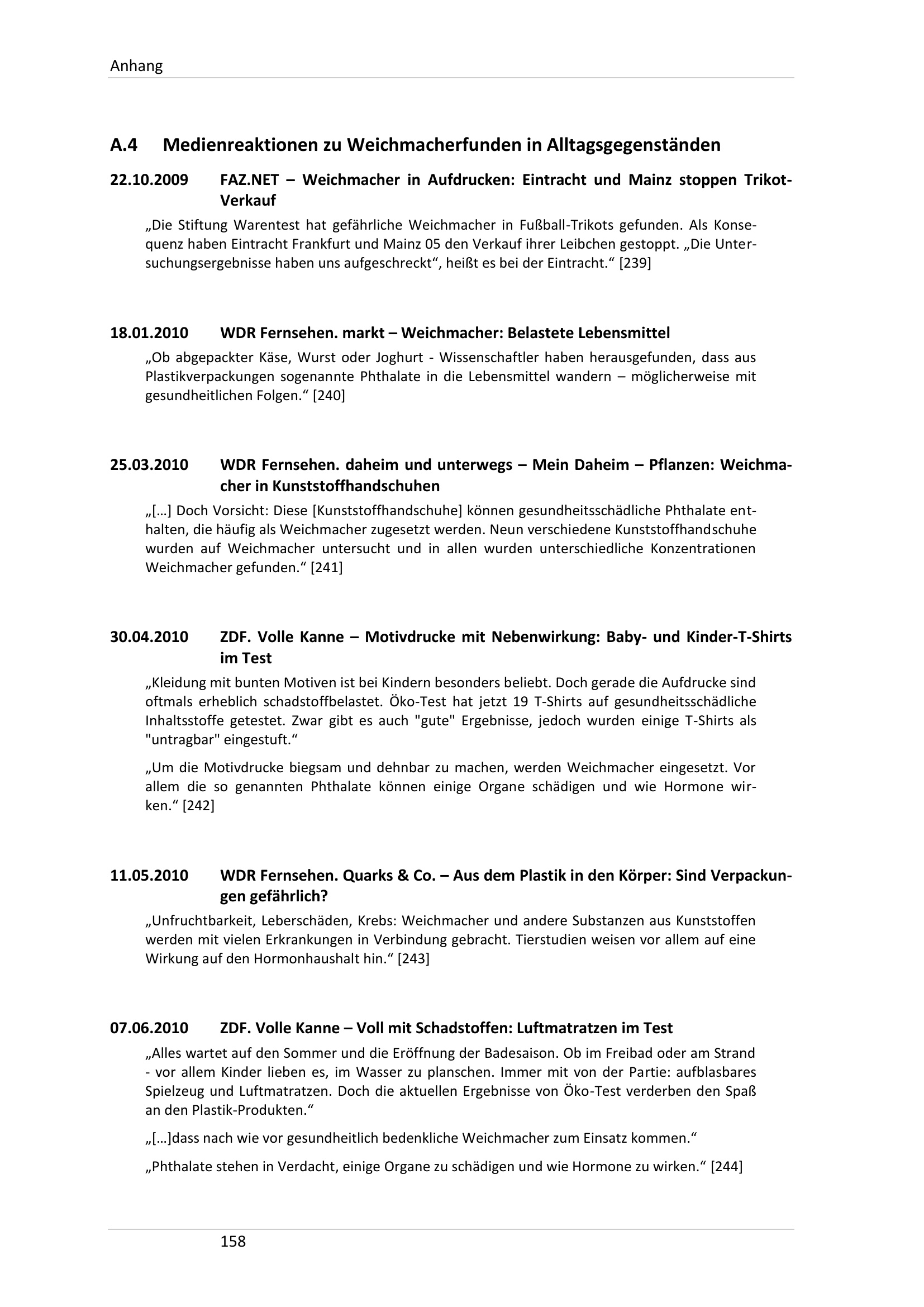 A.4 Medienreaktionen zu Weichmacherfunden in Alltagsgegenständen