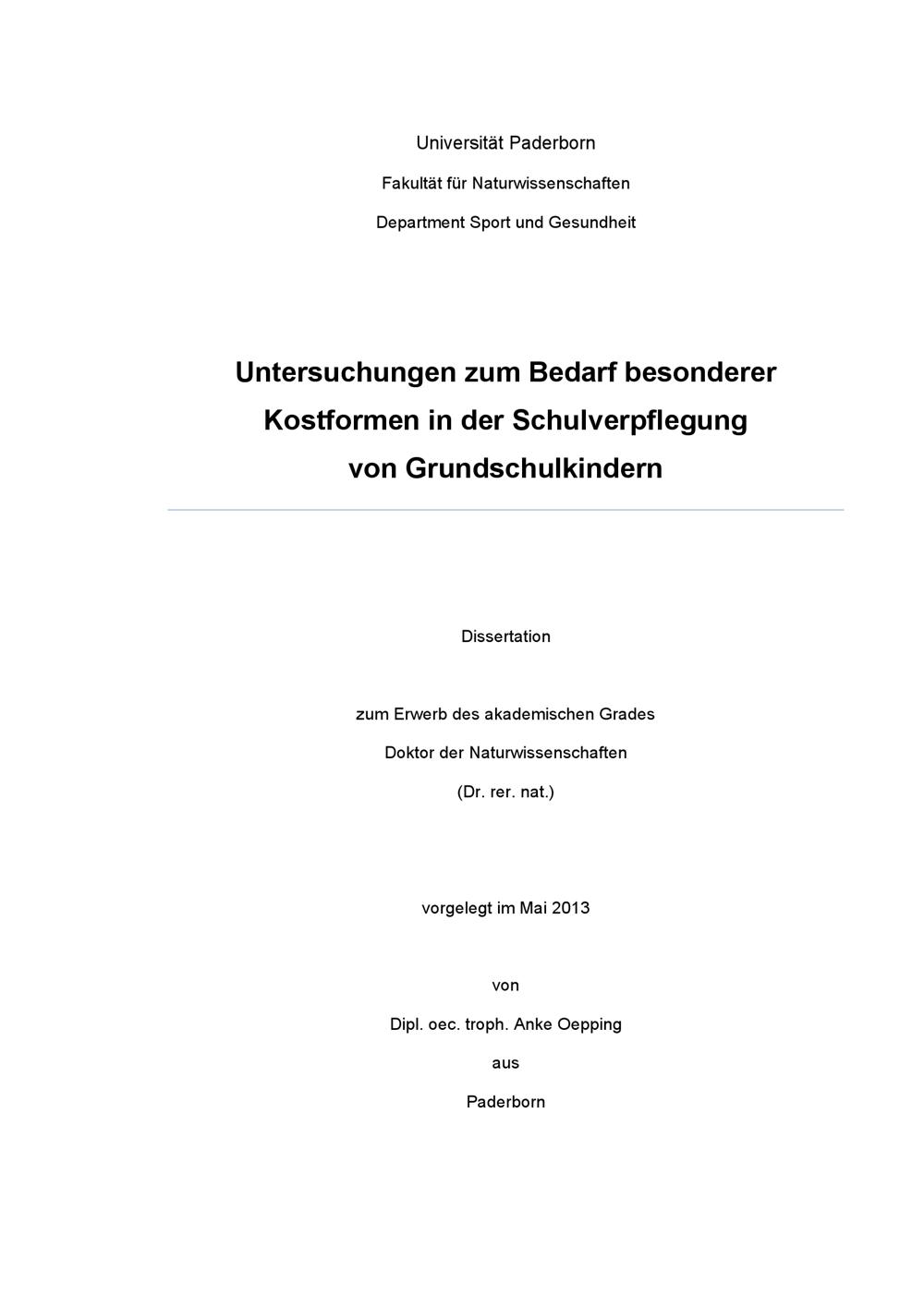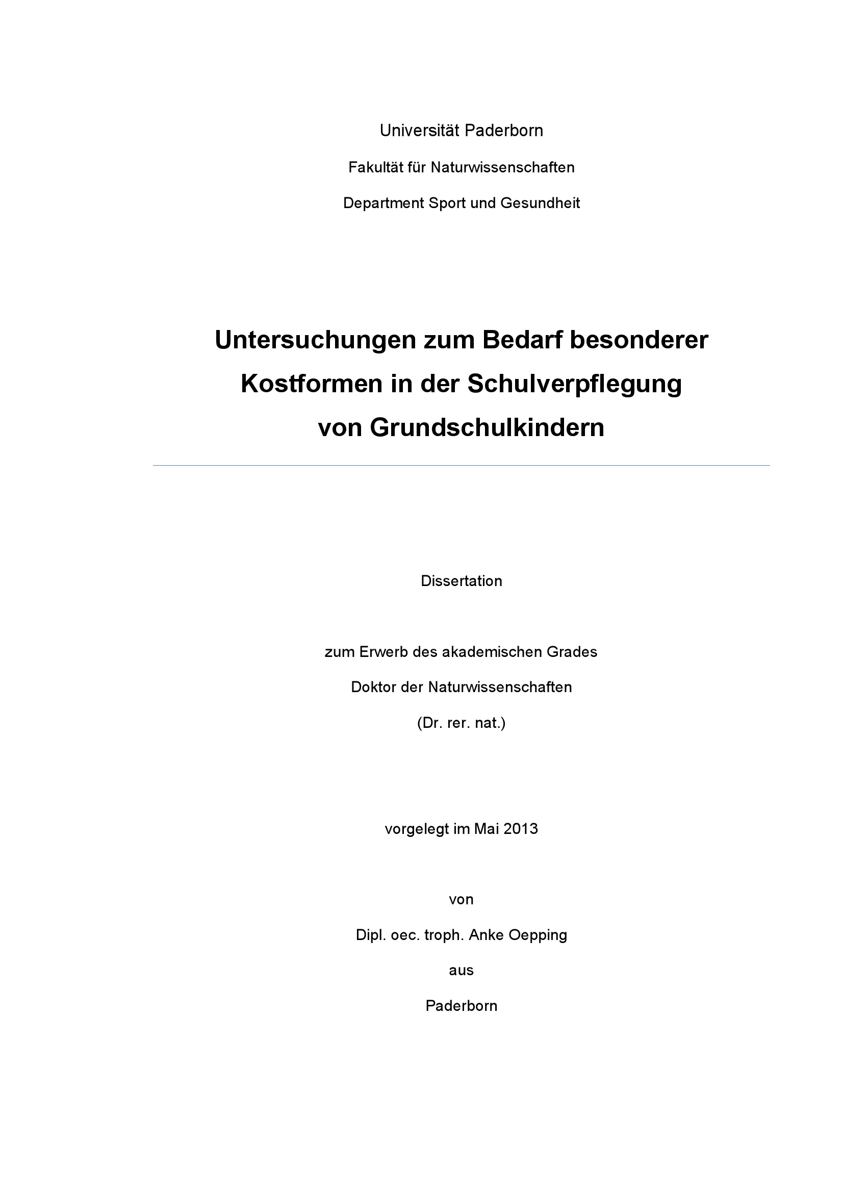 Untersuchungen zum Bedarf besonderer Kostformen in der Schulverpflegung von Grundschulkindern