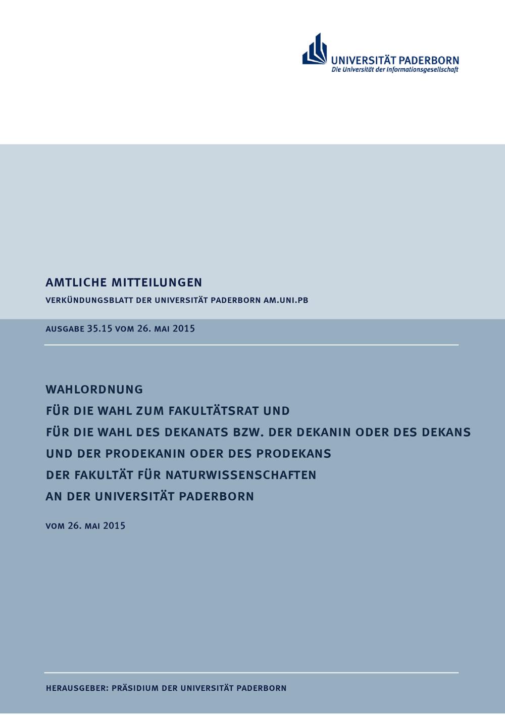 Wahlordnung für die Wahl zum Fakultätsrat und für die Wahl des Dekanats bzw. der Dekanin oder des Dekans und der Prodekanin oder des Prodekans der Fakultät für Naturwissenschaften an der Universität Paderborn : vom 26. Mai 2015